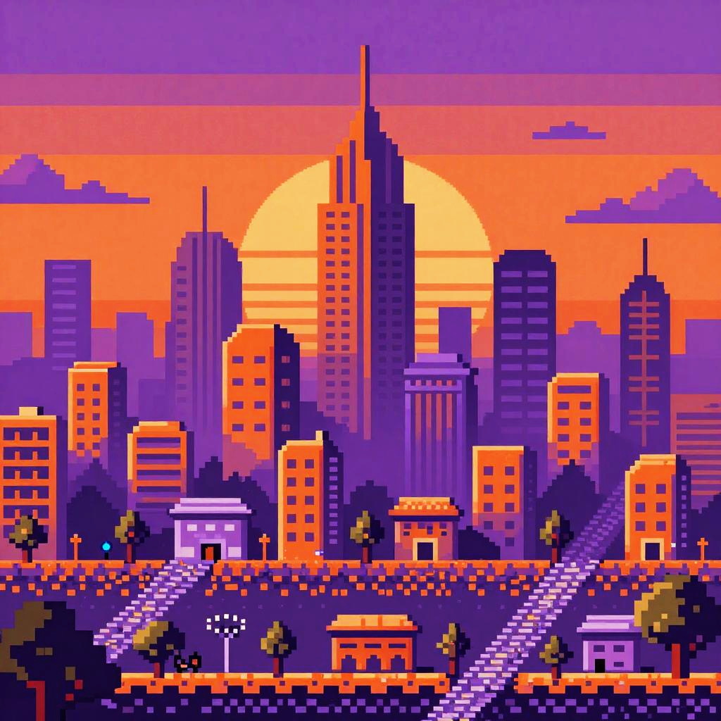 8 bit art generator creating a vibrant pixelated cityscape at sunset, retro color palette with shades of orange and purple, pixel art style, detailed small buildings and cobblestone streets, nostalgic 80s video game aesthetic