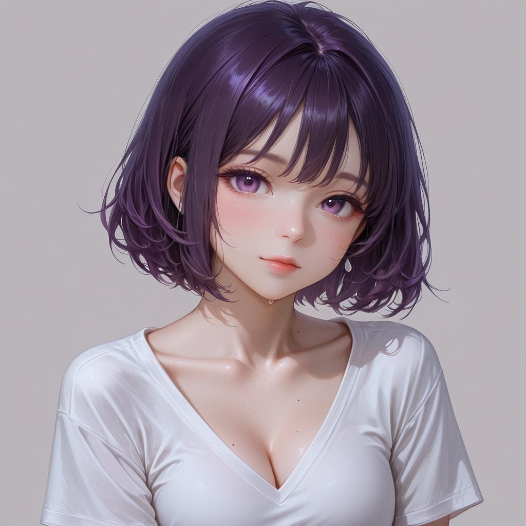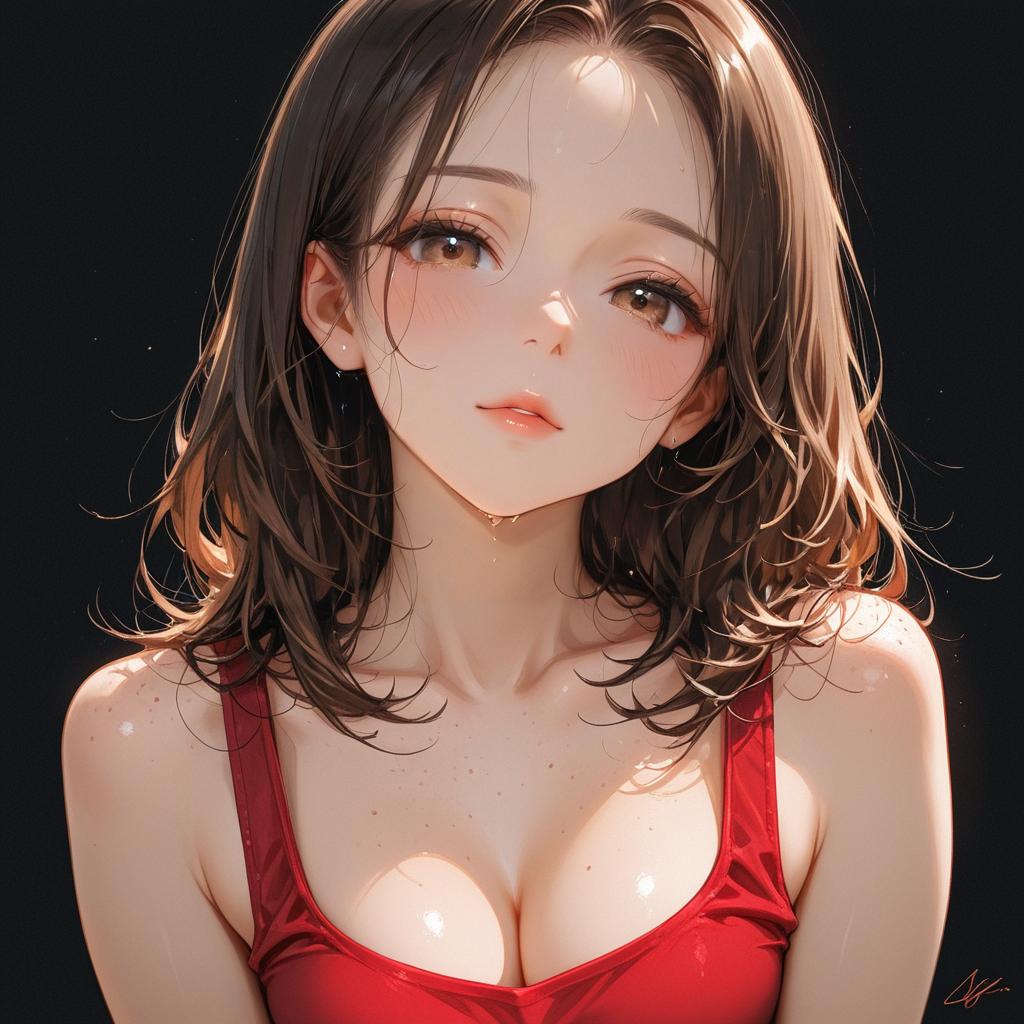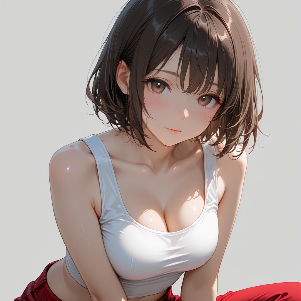 Digital illustration of a young woman with short brown hair and brown eyes, wearing a white tank top and red pants. The artwork features a simple grey background, focusing on her upper body, collarbone, and bare shoulders. The woman has a neutral expression with closed lips and subtle makeup.