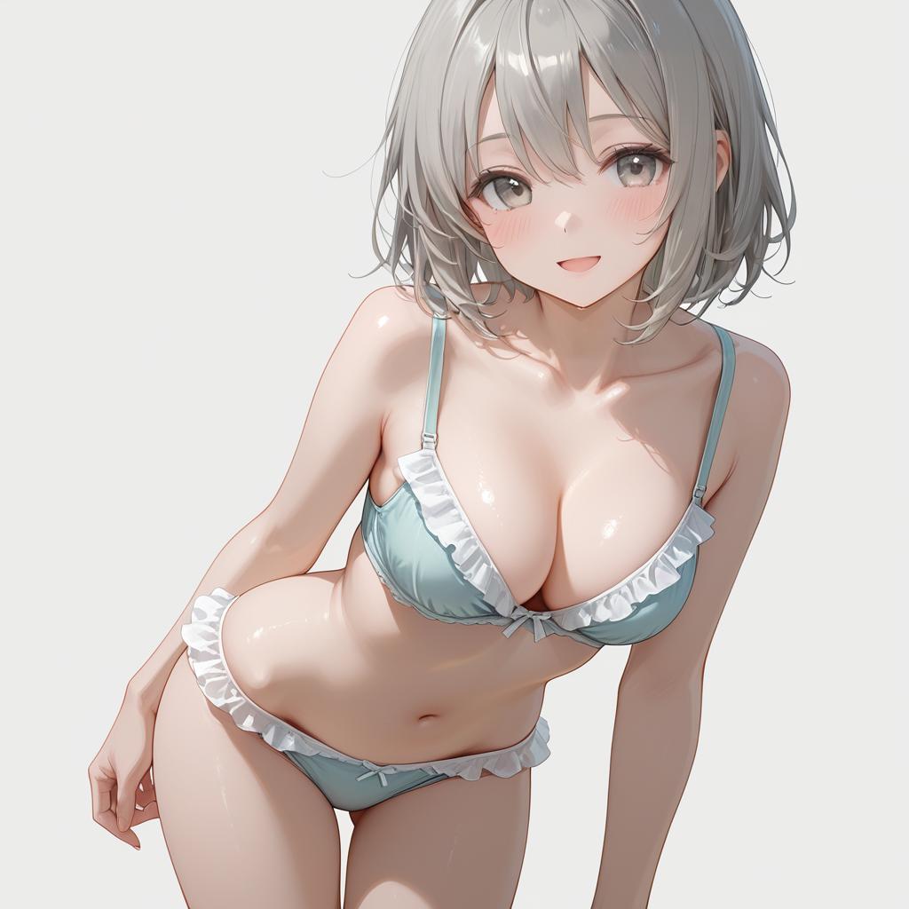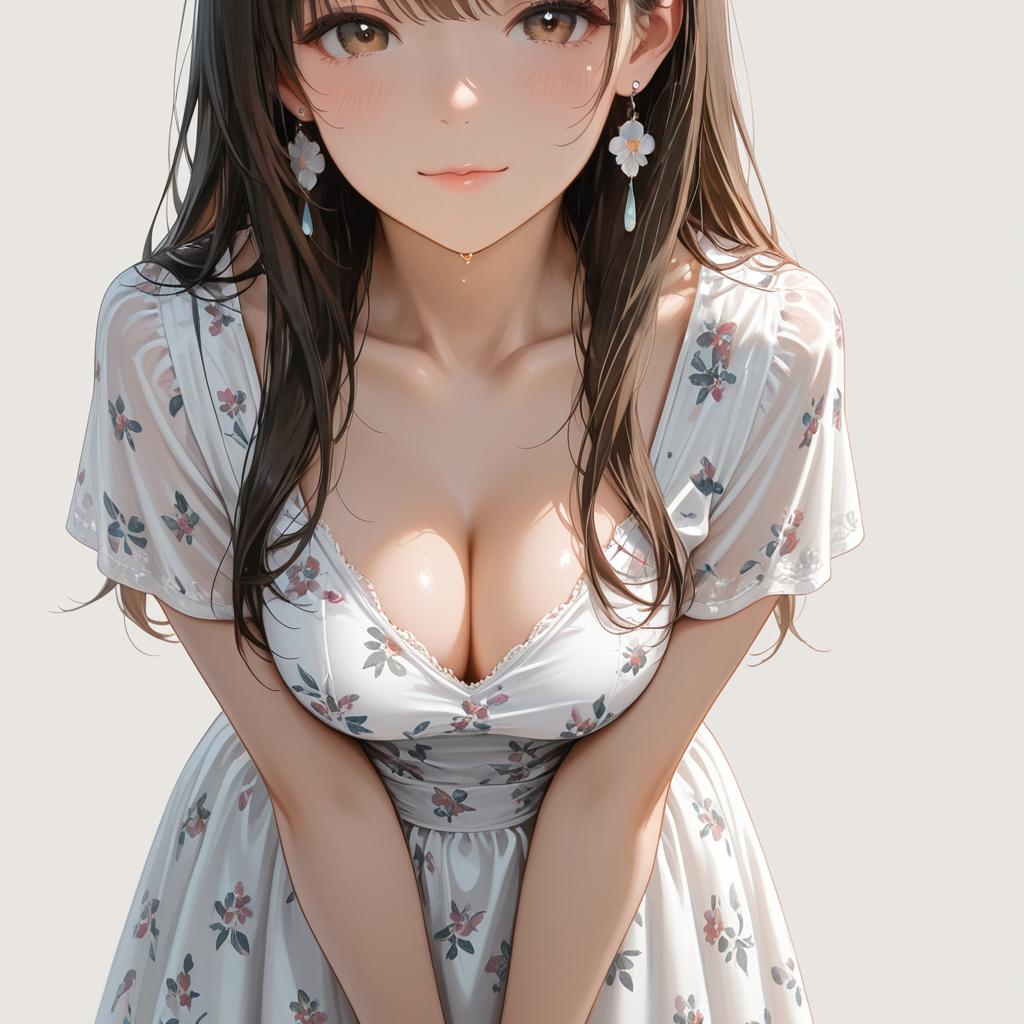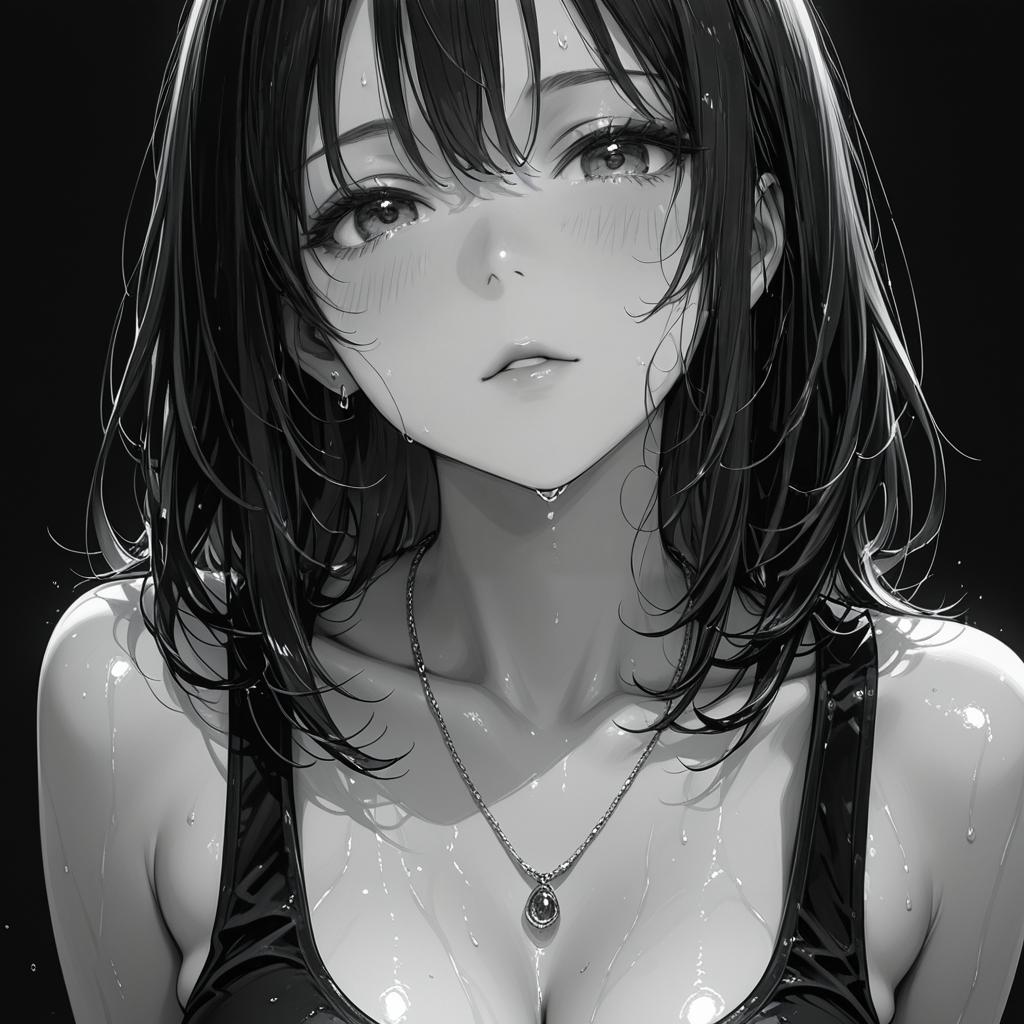 Digital illustration of a young woman with short brown hair and brown eyes, wearing a white tank top and red pants. The artwork features a simple grey background, focusing on her upper body, collarbone, and bare shoulders. The woman has a neutral expression with closed lips and subtle makeup.