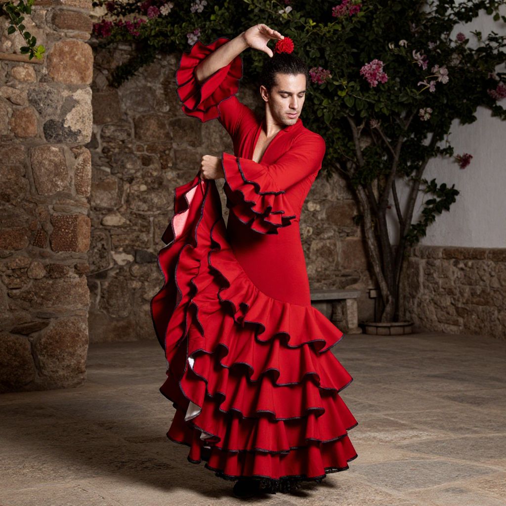Handsome young man in Spanish flamenco dancer outfit, poised mid-dance with flowing red cape, intense expression, detailed ruffles and textures, dramatic lighting highlighting movement, authentic Andalusian setting with rustic stone walls and blooming flowers
