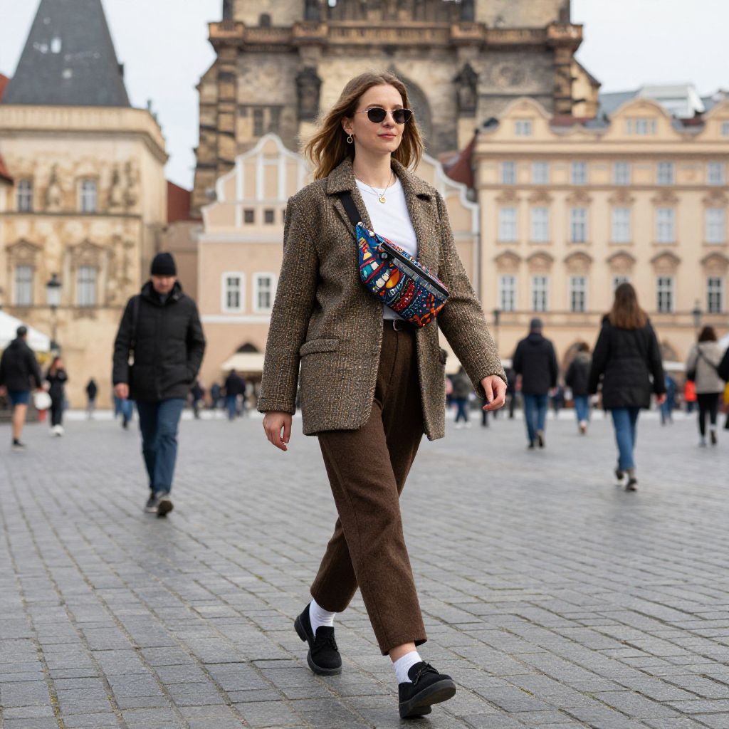 Trendy fanny packs, european woman, smart casual wear, strolling through a historic square in Prague, rich textures, dynamic composition, 2024 street style, 4k realistic photography