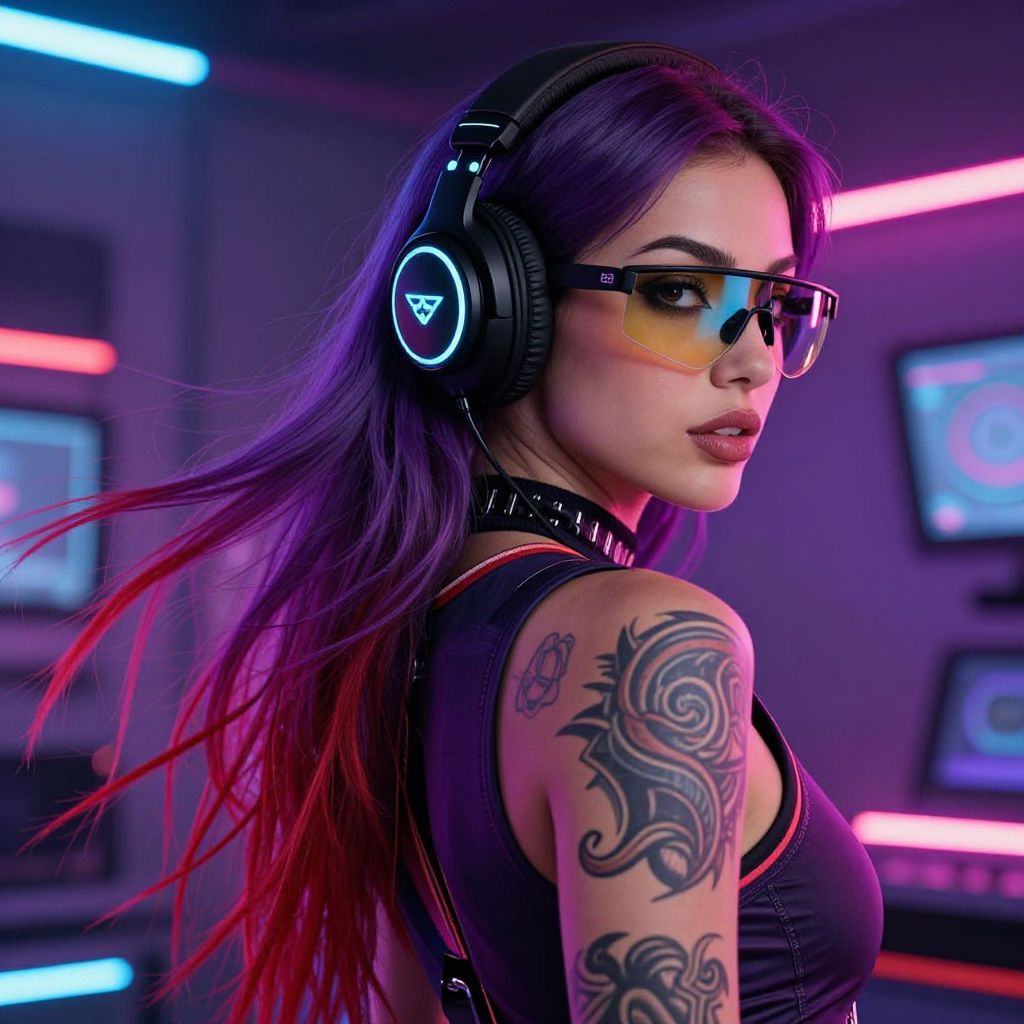 Vibrant neon lights illuminate a cyberpunk-inspired scene featuring a woman with long, flowing hair dyed in shades of purple and red, wearing sleek black headphones with a glowing logo, tinted glasses reflecting the ambient hues, and a form-fitting dark outfit accentuated by intricate tattoos on her arms and chest.