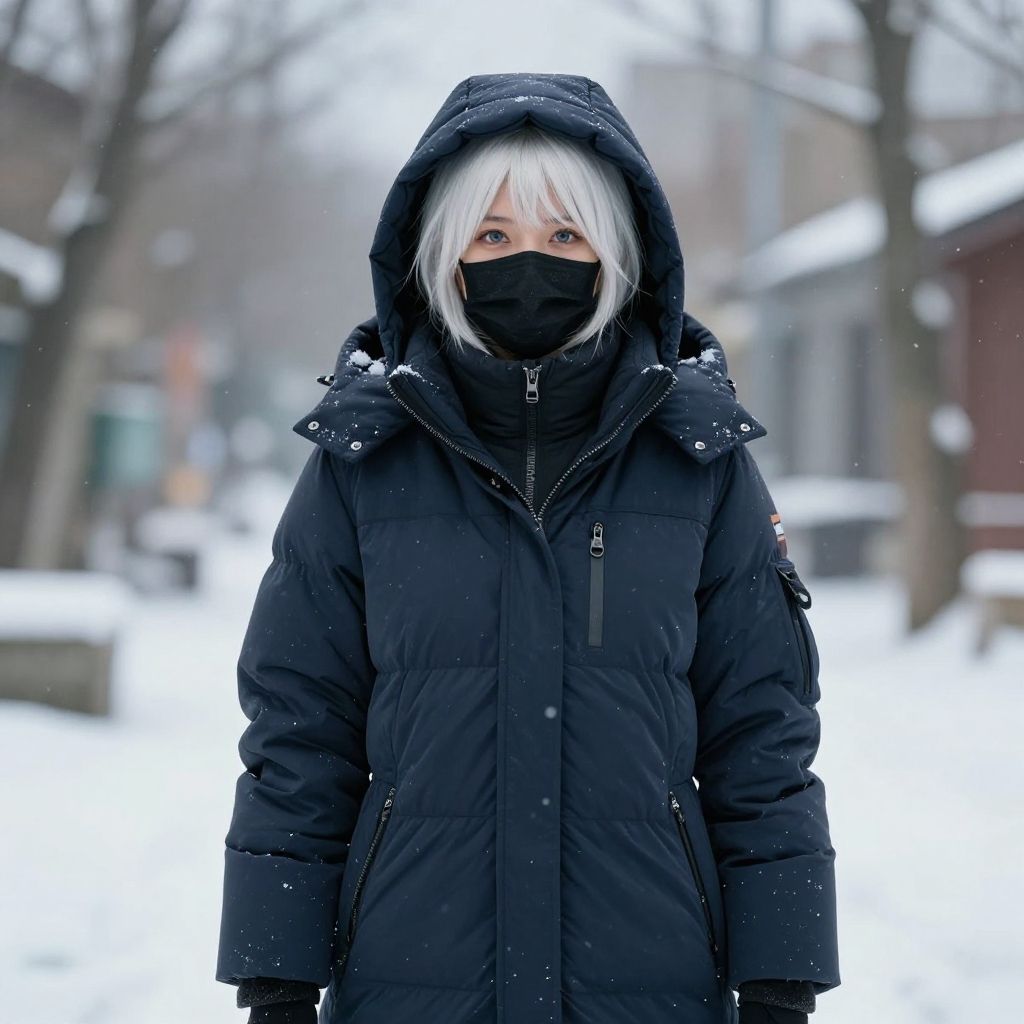 (((Very cold))), (((sherpa long padded down coat))), (((sherpa long padded puffer coat))), (((sherpa long padded winter clothes))), (((puffer hood up))), cowboy shot, (mask:1.6), photorealistic, (((masterpiece))), (((best quality))), ((ultra-detailed)), ((finely detail)), ((highres)), 1girl, looking at viewer, white hair, blue eyes, short hair, (Thick padded collar:1.4), (TSH:1.4), (Thick padded cuffs:1.4)
