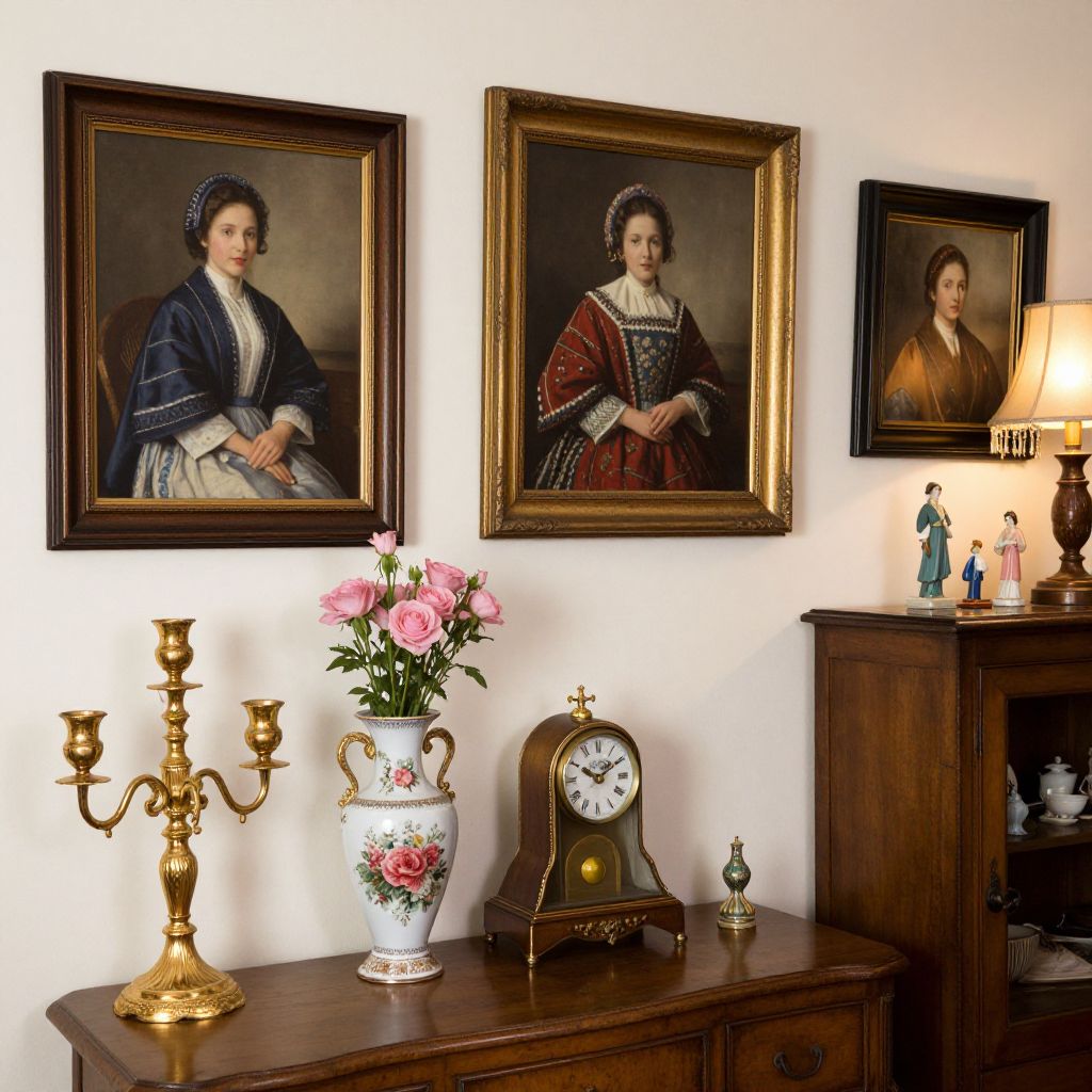 Antique furniture and decor showcase a curated collection featuring three framed portraits, including one of a woman in traditional attire, alongside ornate gold candlesticks, a floral-patterned vase with pink flowers, a vintage clock, and a wooden cabinet with a lit lamp and miniature figurines, all arranged in a cozy, vintage-inspired setting.