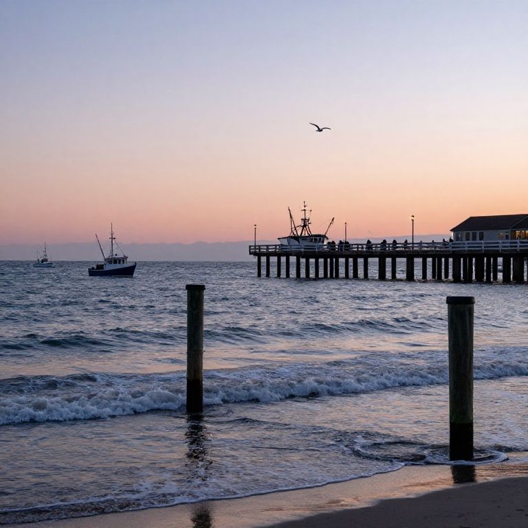 Berkley seaside pier at sunset, gentle waves lapping against wooden posts, silhouettes of fishing boats and seagulls flying overhead, warm pastel sky blending pinks and blues, calm and peaceful environment, highly detailed natural setting