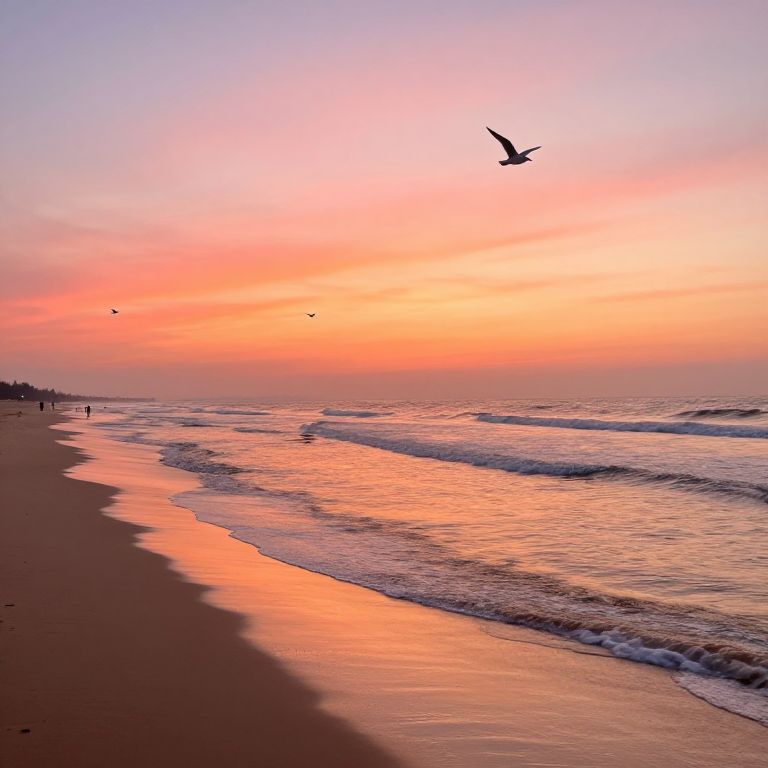 Photograph of a serene beach at sunset. The sky transitions from pale orange to soft blue. In the foreground, gentle waves lap against the sandy shore, with three wooden posts standing in the sand. To the right, a pier extends into the water, with a small building at its end and fishing boats anchored nearby. A single bird flies above. The ocean is calm, reflecting the sky's colors, and the horizon is faintly visible. The image evokes a peaceful, coastal ambiance.