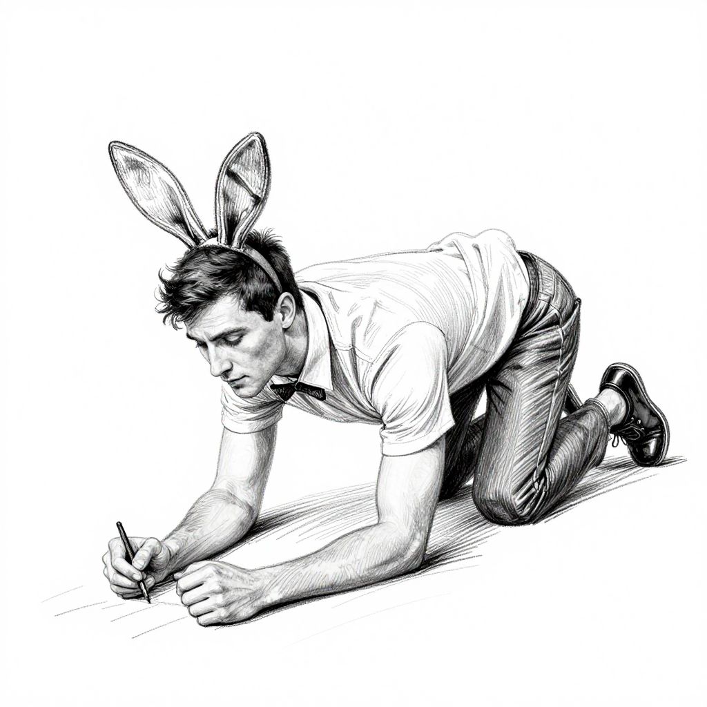 Black-and-white sketch of a man with bunny ears, kneeling and writing on the floor, wearing a collared shirt and pants.