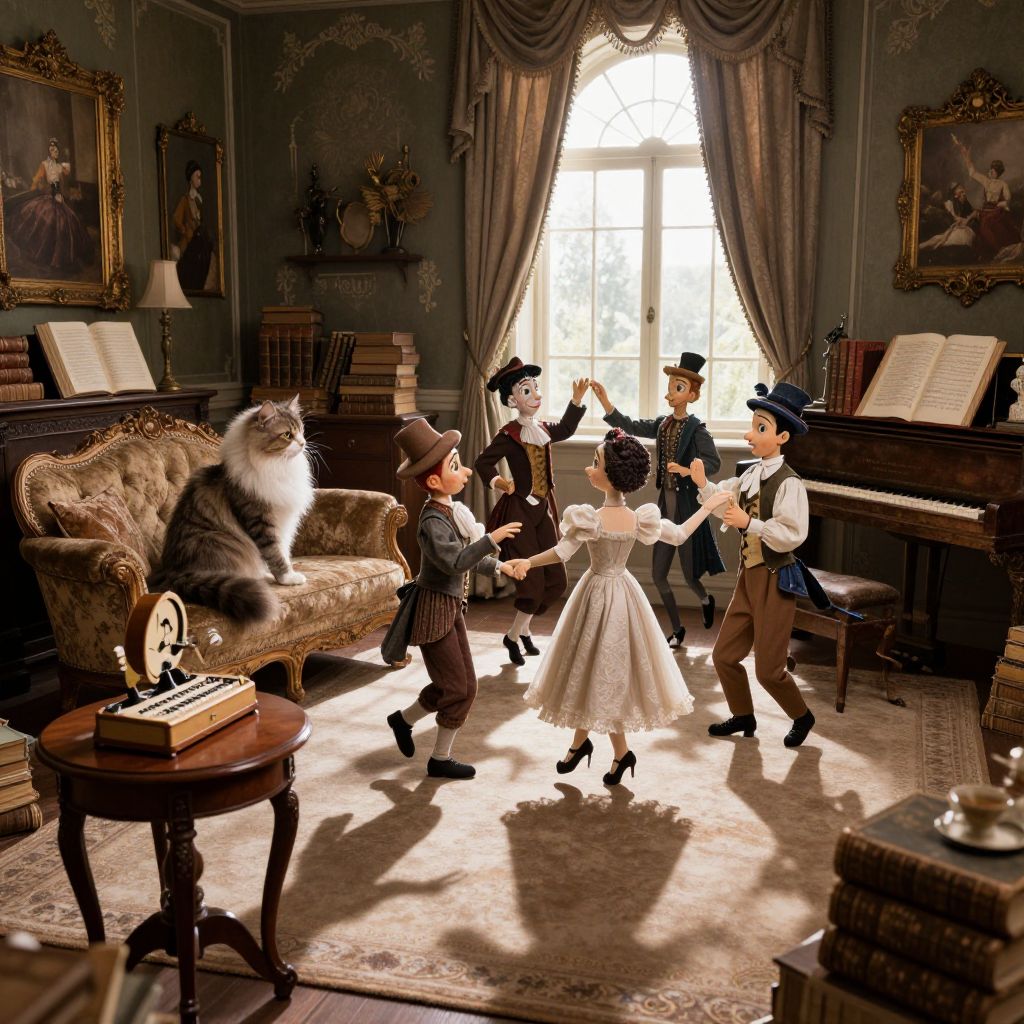 Imagine a whimsical, dreamlike scene in a quaint Victorian-era study filled with antiquated books and an elegant grand piano in the corner. An enormous, fluffy cat sits regally upon an ornate velvet sofa, its tail swishing gently as it observes a peculiar ritual unfolding. In the center of the room, a group of mismatched puppets dressed in elegant period attire dance to the soft melody of a music box playing on a nearby mahogany side table. The dance is choreographed with eccentric flair, reflecting both elegance and absurdity, casting an air of mystery and mirth throughout the room as light from the bay window casts shadows that playfully mingle with the figures' movements.