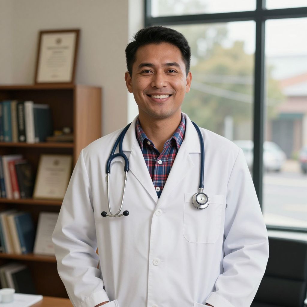 A confident man in his 30s with short, neat black hair and a warm, friendly smile, wearing a pristine white lab coat over a crisp red and blue plaid shirt with subtle horizontal stripes, and a stethoscope gently resting on his chest. He stands in a softly lit medical office with warm, natural lighting filtering through a large window, revealing a quiet street outside with trees and a gentle breeze. Behind him, a well-organized bookshelf filled with medical textbooks and framed diplomas adds a professional touch. The atmosphere is calm, welcoming, and approachable, exuding warmth, expertise, and genuine kindness—perfectly capturing the balance of professionalism and human connection in a healthcare setting.