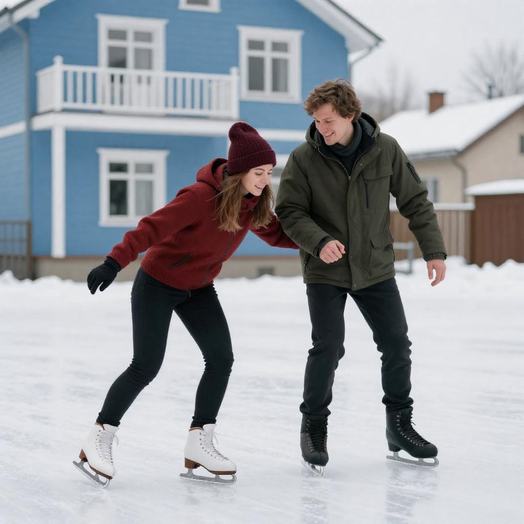 Photograph of a couple ice skating outdoors. The woman, with light skin, red sweater, black pants, and maroon beanie, leans forward, holding the man's arm. The man, with light skin, green jacket, black pants, and brown hair, smiles. A blue house with a white balcony is in the background. Snow covers the ground.