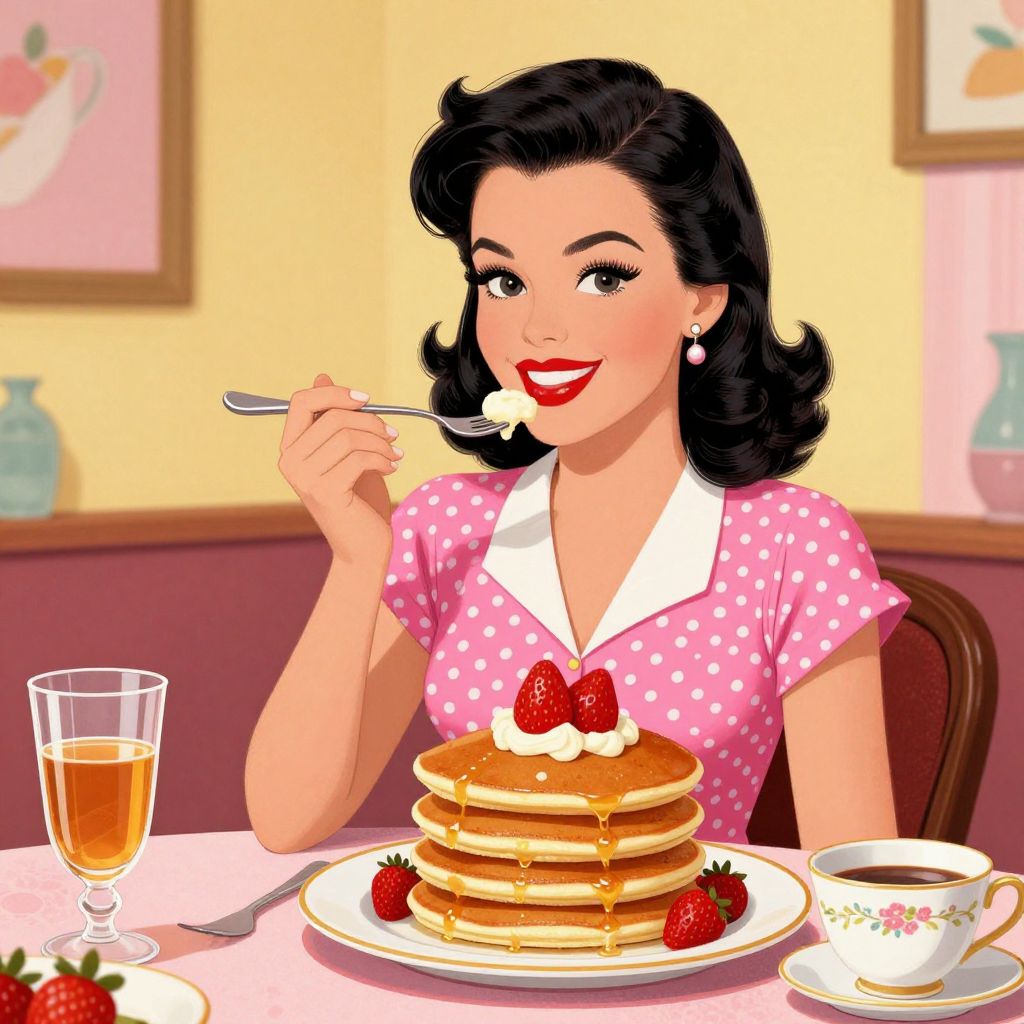 A vibrant retro-style illustration depicts a cheerful woman enjoying a cozy afternoon tea setting, featuring pancakes topped with strawberries, a glass of amber liquid, and a delicate teacup, rendered in a nostalgic, high-definition pop art aesthetic reminiscent of mid-century Americana.