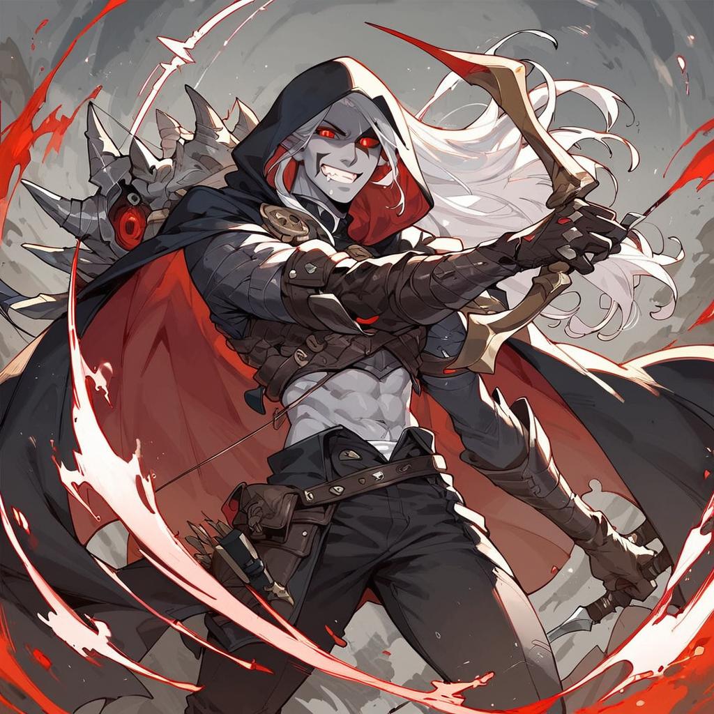 Score_9, score_8_up, score_7_up, masterpiece, pointy ears, long hair, hood, breastplate, pauldrons with white skulls, gloves, grey skin, red eyes, armor, cape, pants, white hair, midriff, glowing eyes, black tears, undead, grin, holding weapon, bow (weapon), arrow (projectile), quiver