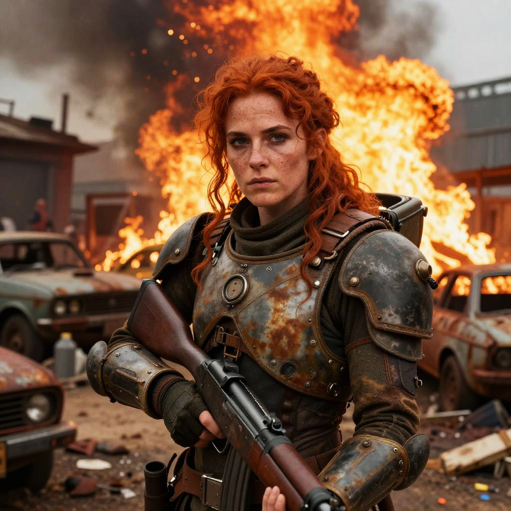 Close-up portrait of a red-haired woman with freckles wearing rugged, rusted power armor, holding a rifle with both hands in a post-apocalyptic junkyard setting. Behind her, a large fire blazes with smoke rising, surrounded by corroded, abandoned cars and debris. The scene features natural lighting with a cinematic composition, capturing a dramatic and detailed face with intense expression.