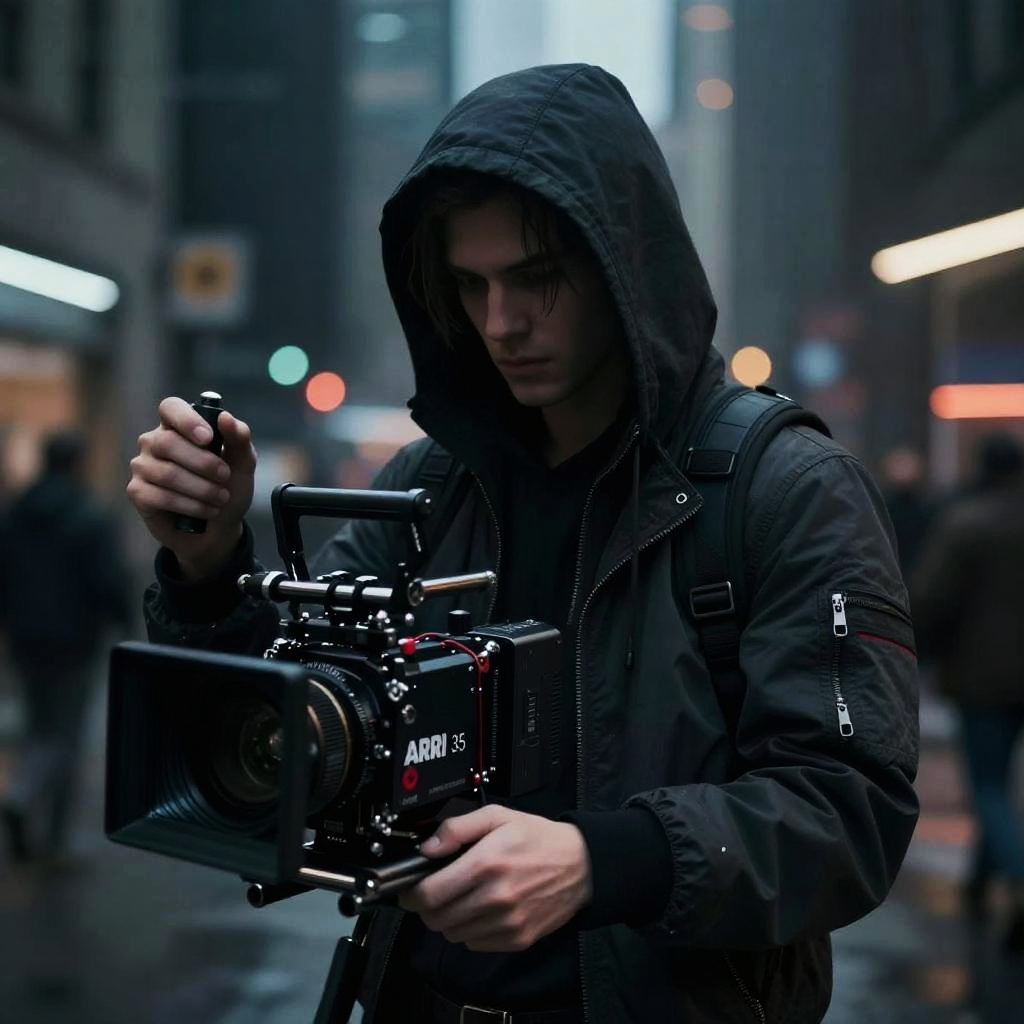 A young man wearing a dark hooded jacket operates a professional ARRI Alexa 35 cinema camera. The setting is an urban environment with a moody, low-key color grading, suggesting a cyberpunk or futuristic city atmosphere. The man is focused on filming, with the camera held steady, and blurred city lights in the background.