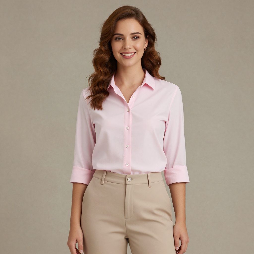 A photograph features a close-up of a woman in the foreground wearing a vibrant blue, button-up, long-sleeve shirt with rolled-up cuffs and dark blue jeans. The background shows a blurred, full-body image of the same woman in a similar blue shirt and dark blue jeans. She has shoulder-length, wavy brown hair. The white background emphasizes the blue shirt, which has subtle chest pockets. The image focuses on the shirt's texture and color, highlighting its crisp, tailored fit.