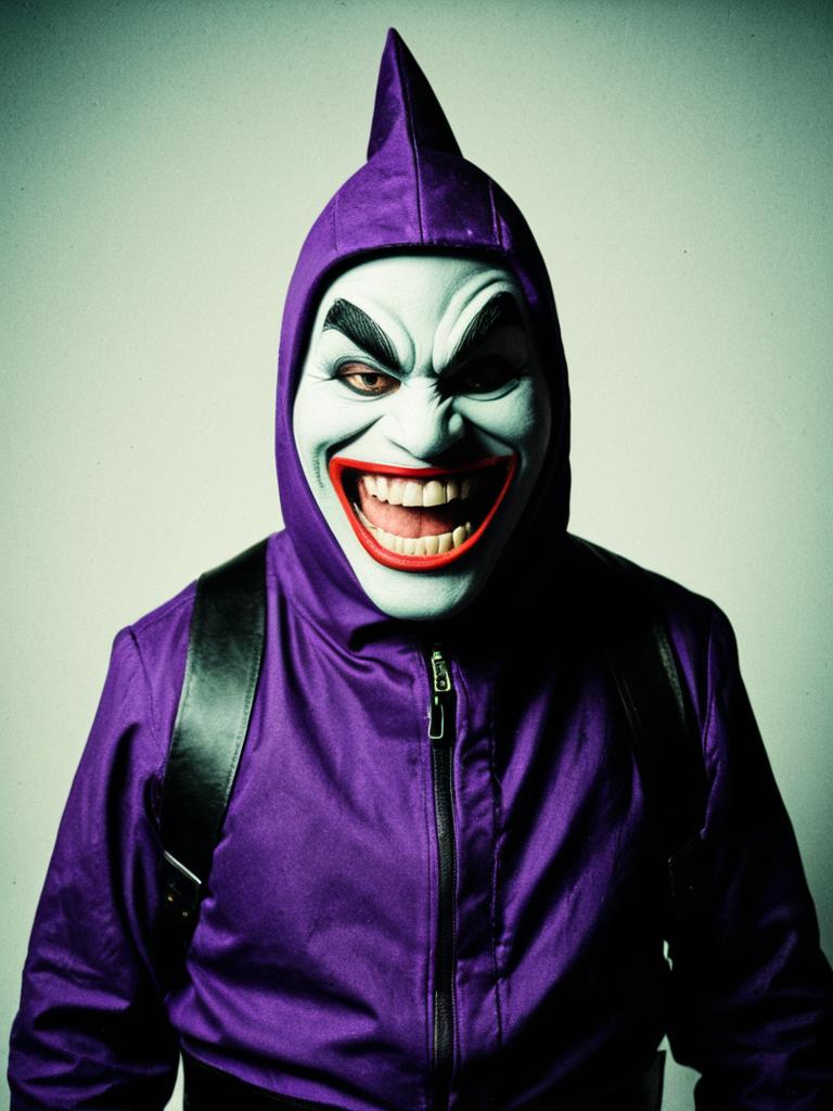 Waist-up portrait of a man wearing a purple grimace clown costume with a large white and orange clown mask featuring exaggerated facial features and a wide smile. The background is plain and dark, emphasizing the colorful costume and mask.