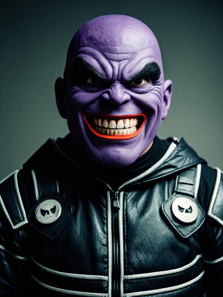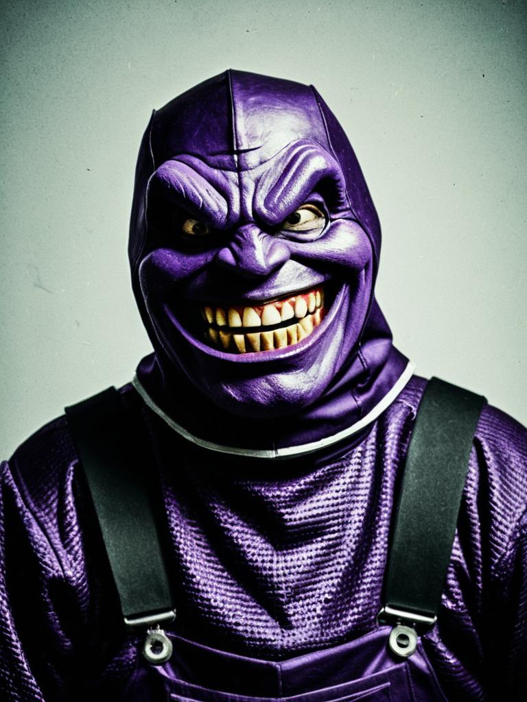 Man in Grimace Costume, waist-up editorial portrait, photorealistic tones