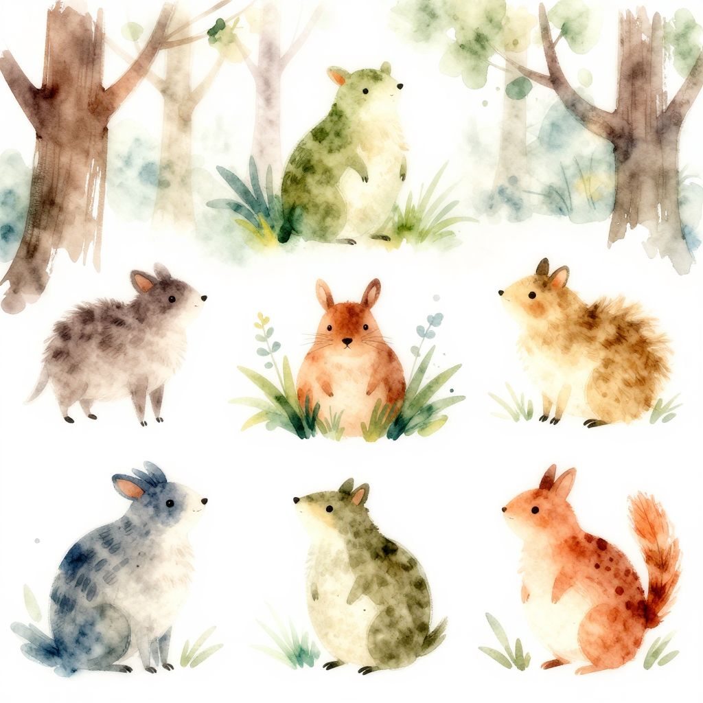 Watercolor illustration styles featuring whimsical woodland creatures with loose washes, vibrant yet translucent hues, emphasizing natural light and fluidity, combined with subtle splatters and organic shapes to evoke a fairytale forest.