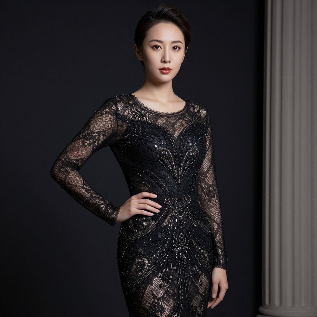 Photograph of an Asian woman with fair skin and short, dark hair, standing against a dark background with a white column on the right. She wears a form-fitting, long-sleeved black lace dress adorned with sparkling sequins, creating a shimmering effect. Her right hand rests on her hip, and she gazes directly at the camera with a composed expression. The lighting highlights her dress's intricate lace pattern and sequin details, adding a glamorous touch to the image.