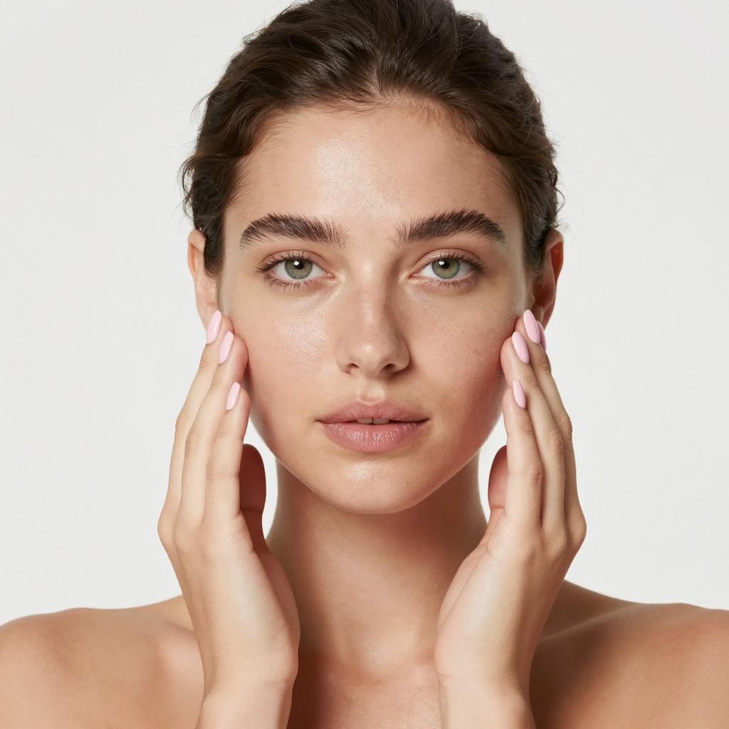 Photograph of a woman with light brown skin and green eyes. She has dark brown hair pulled back and is facing forward. She touches her cheeks with both hands, which have long, light pink nails. Her face is smooth with a slight sheen, and she has a small mole on her right cheek. She has a neutral expression. She is nude from the shoulders up. The background is plain white.