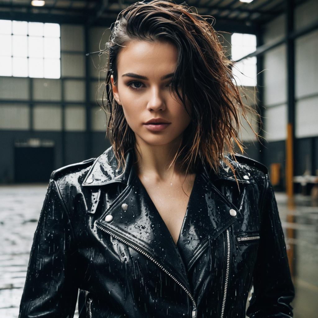 Wet Look hairstyle on fashion model, wearing tailored leather jacket, in industrial warehouse, captured in fashion editorial style with soft natural light.