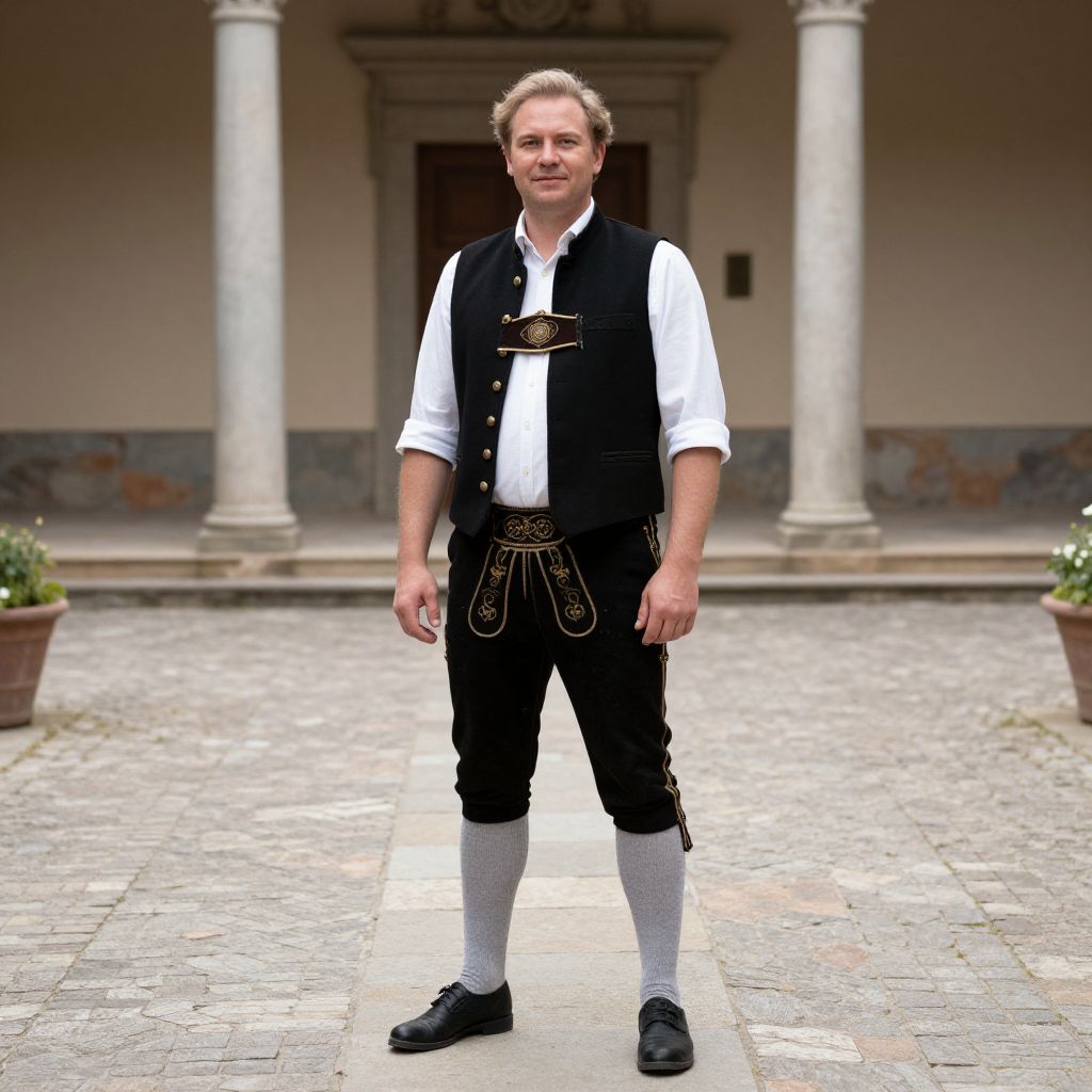German national dress male, man in a black vest and white shirt standing in a courtyard