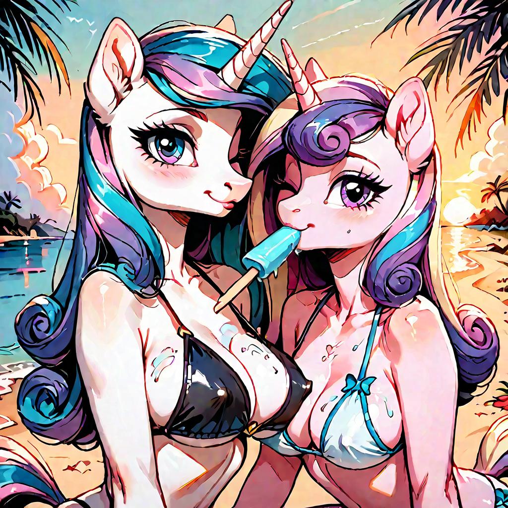 Score_9, score_8_up, score_7_up, score_6_up, score_5_up, score_4_up, source_pony, rating_suggestive, (duo), beach, happy, oiled, shiny, large breasts, cute pony face, masterpiece, countershading, detailed soft lighting, oil painting, ear fluff, sunset ADDCOMManthro princess cadance sucking on a popsicle, winking at viewer, black sexy bikini, nipple outline ADDCOLanthro princess flurry heart, peace sign, blue frilly bikini