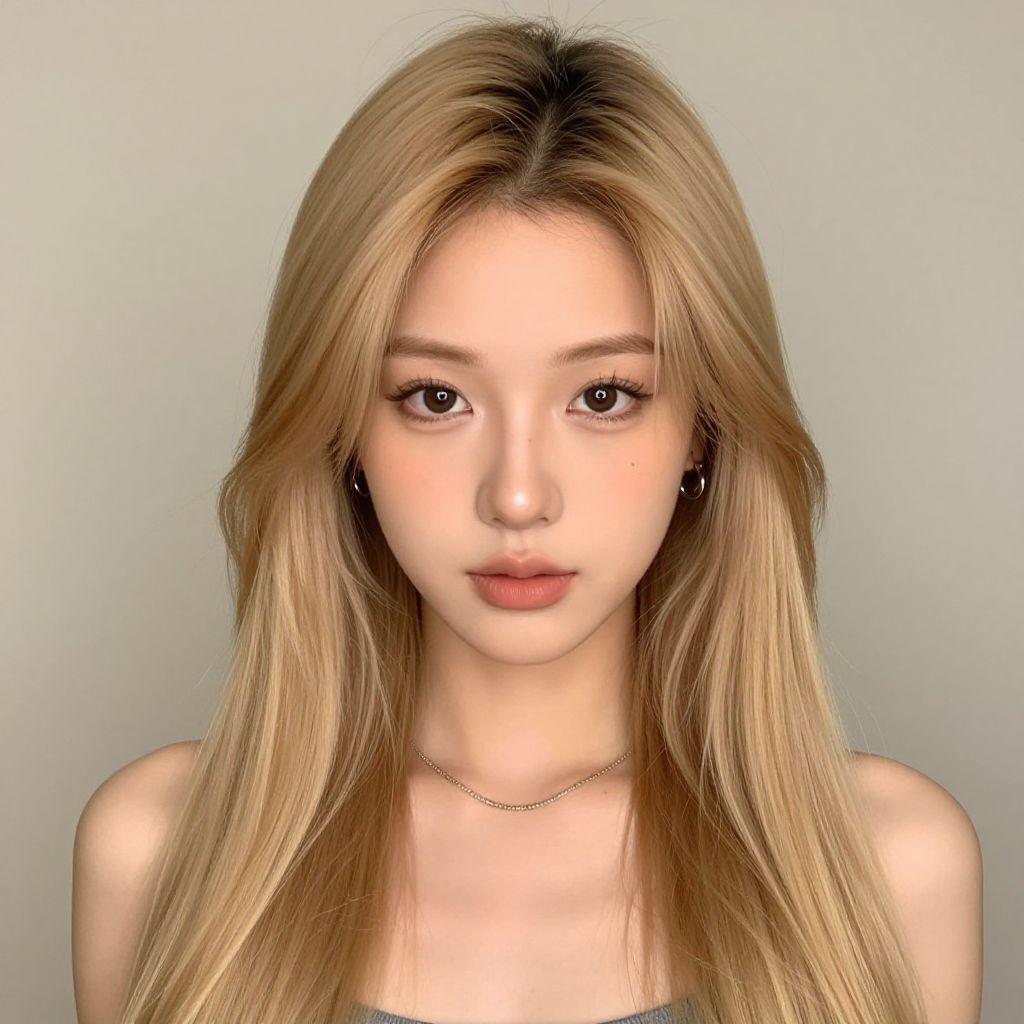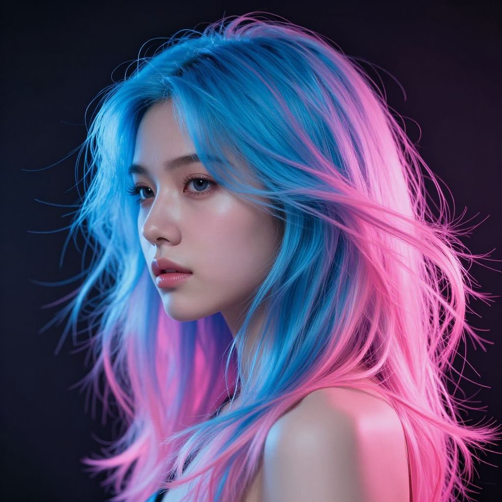 Photograph of an East Asian woman with long, straight, vibrant blue hair, wearing a black tank top, small hoop earrings, and a delicate chain