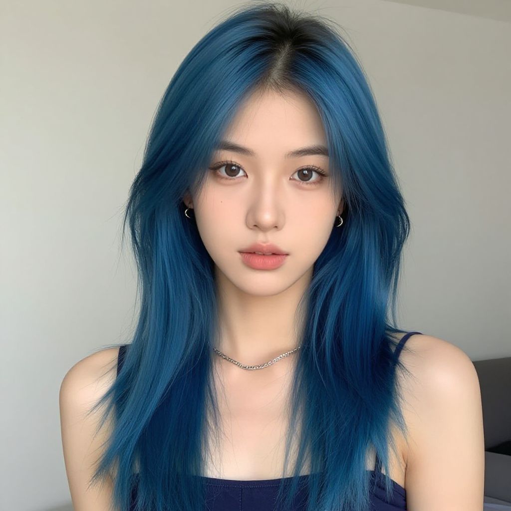 Photograph of an Asian woman with long, straight, vibrant blue hair, parted in the middle. She has fair skin, delicate features, and wears subtle makeup with pink lipstick. Her eyes are dark brown and she gazes directly at the camera with a neutral expression. She is wearing a black tank top with thin straps, small hoop earrings, and a thin chain necklace. The background is a simple, light-colored wall with a dark piece of furniture partially visible on the right. The lighting is soft and natural, highlighting her hair and face.
