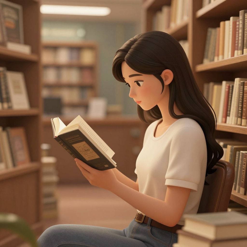 Digital illustration of a young woman with long black hair, wearing a white t-shirt and blue jeans, sitting in a library, reading a book. Warm