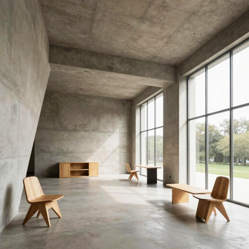 Brutalisme-inspired interior space: raw concrete walls and ceilings with angular features, minimalist furniture in natural materials, large windows flooding natural light, emphasizing cold, utilitarian and functional design aesthetics with a touch of warmth from natural light
