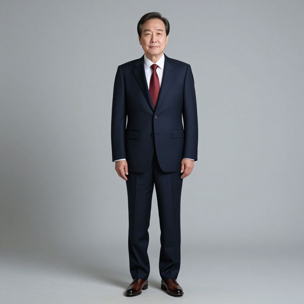 Photograph of an East Asian man standing against a plain, light gray background. He has short, neatly combed black hair and a fair complexion. He is wearing a dark navy blue, well-fitted suit with a white dress shirt and a burgundy tie. His black dress shoes are polished and shiny. He stands with his arms relaxed by his sides, facing the camera with a neutral expression. The lighting is even, eliminating shadows, and the image has a professional studio quality.