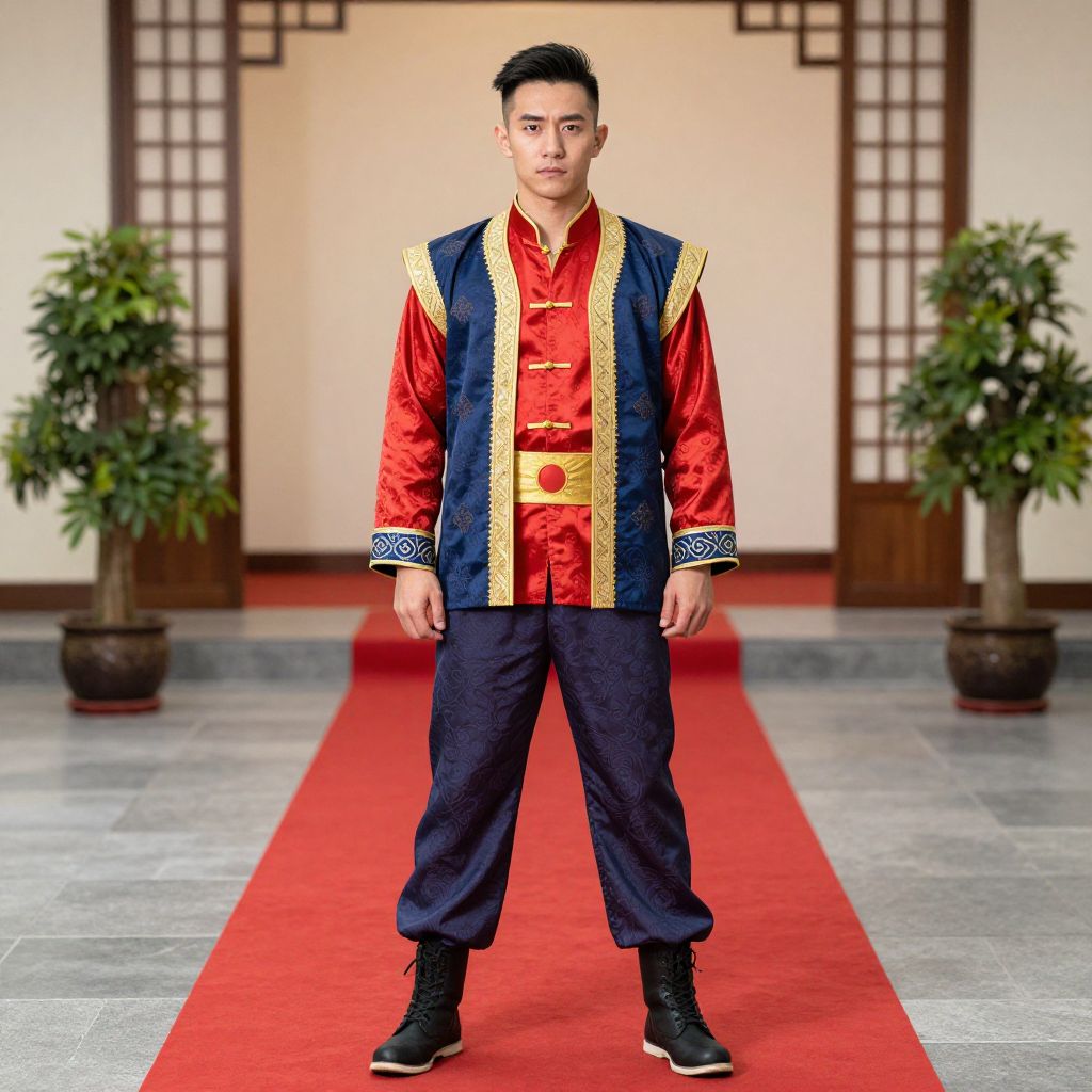 Jiren Costume, dressed in traditional chinese clothing standing on a red carpet