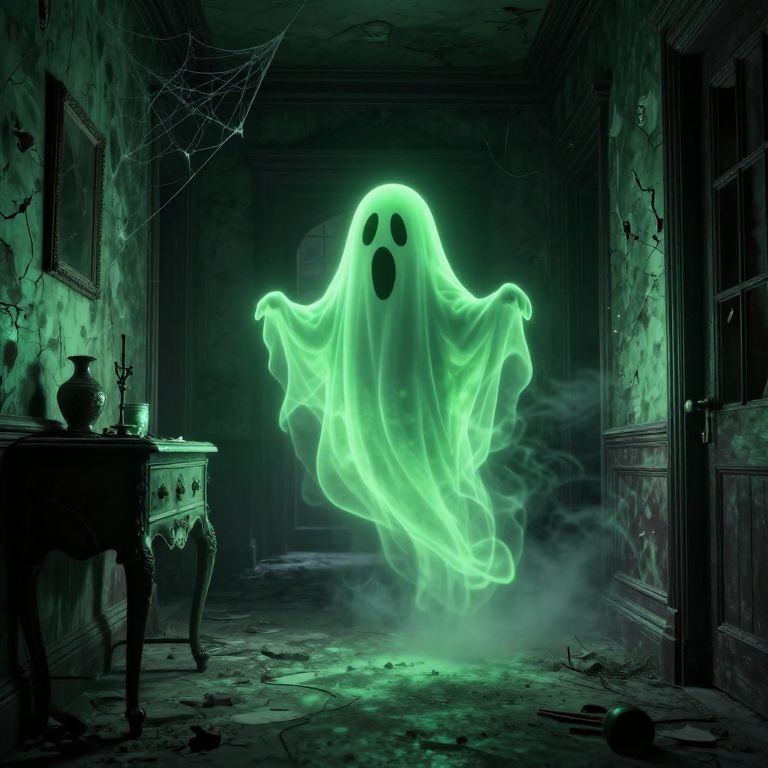Slimer ghost floating through an abandoned spooky mansion corridor, green glow illuminating dusty antique furniture, misty atmosphere with cobwebs and cracked wallpaper, realistic ghostly spectral effect