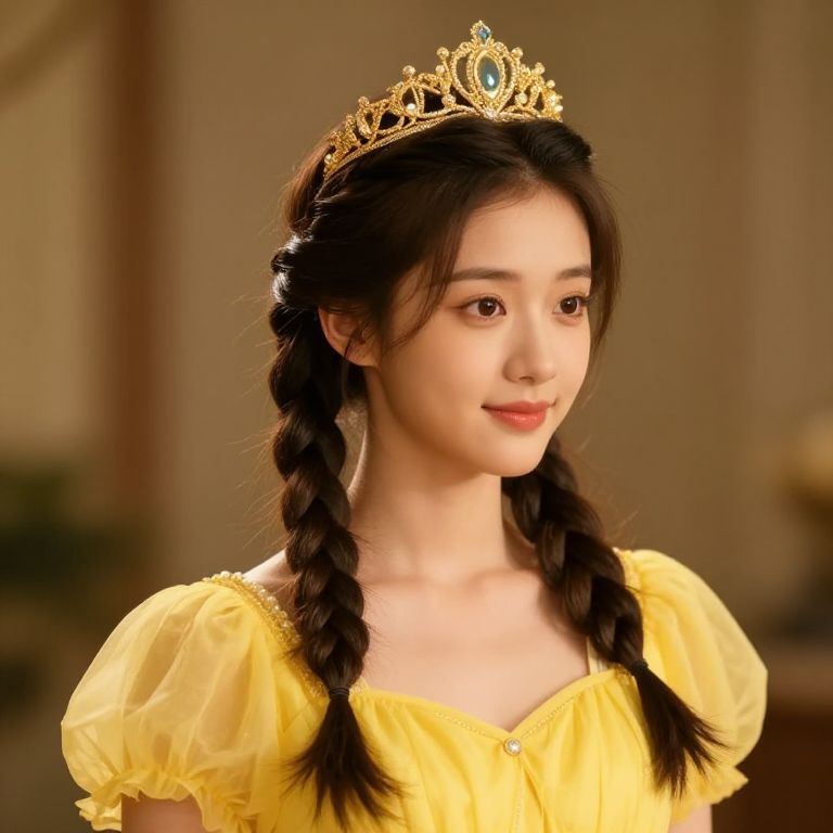 Asian girl with braids and a crown on her head.