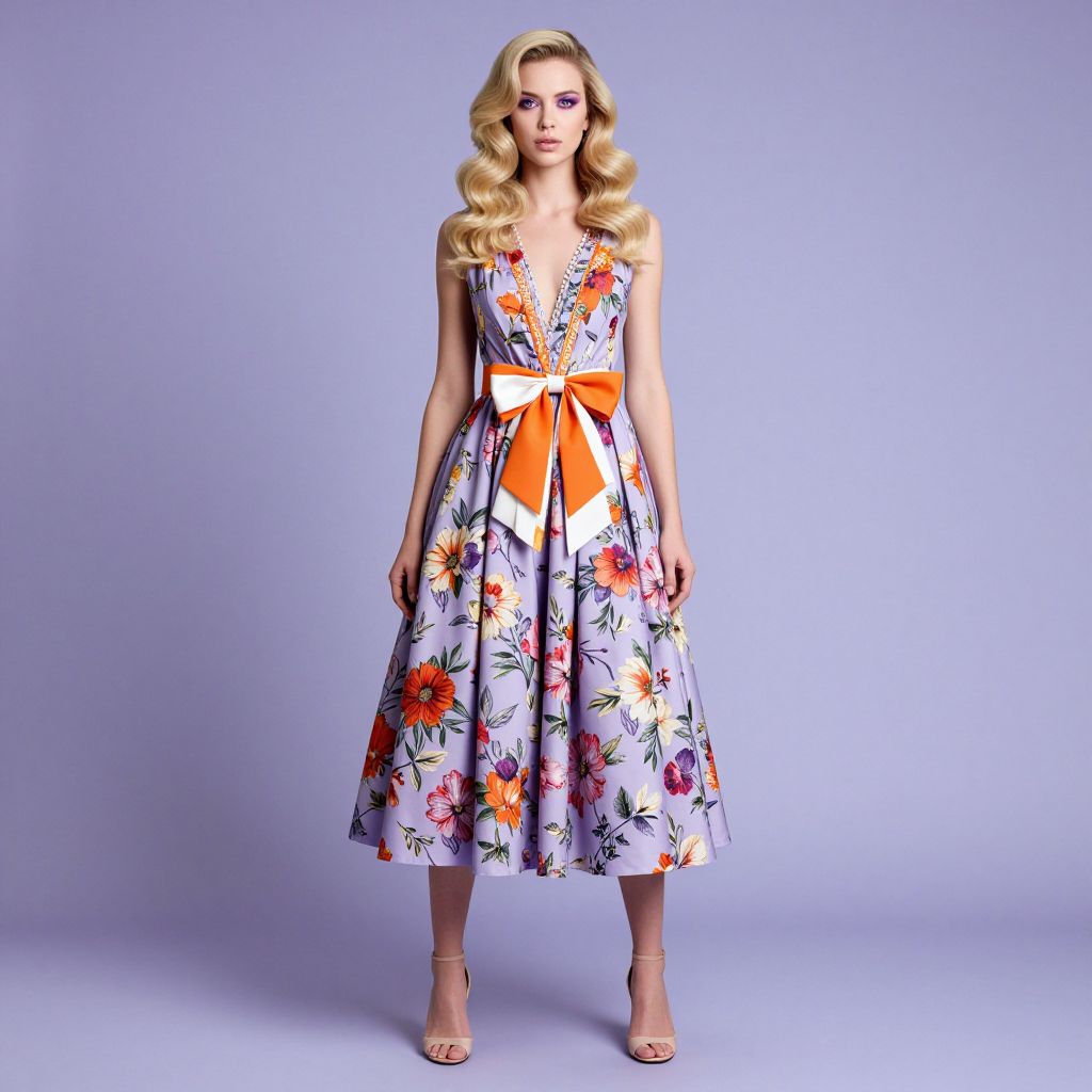 A woman with a hat adorned with flowers and butterflies, wearing a colorful coat.