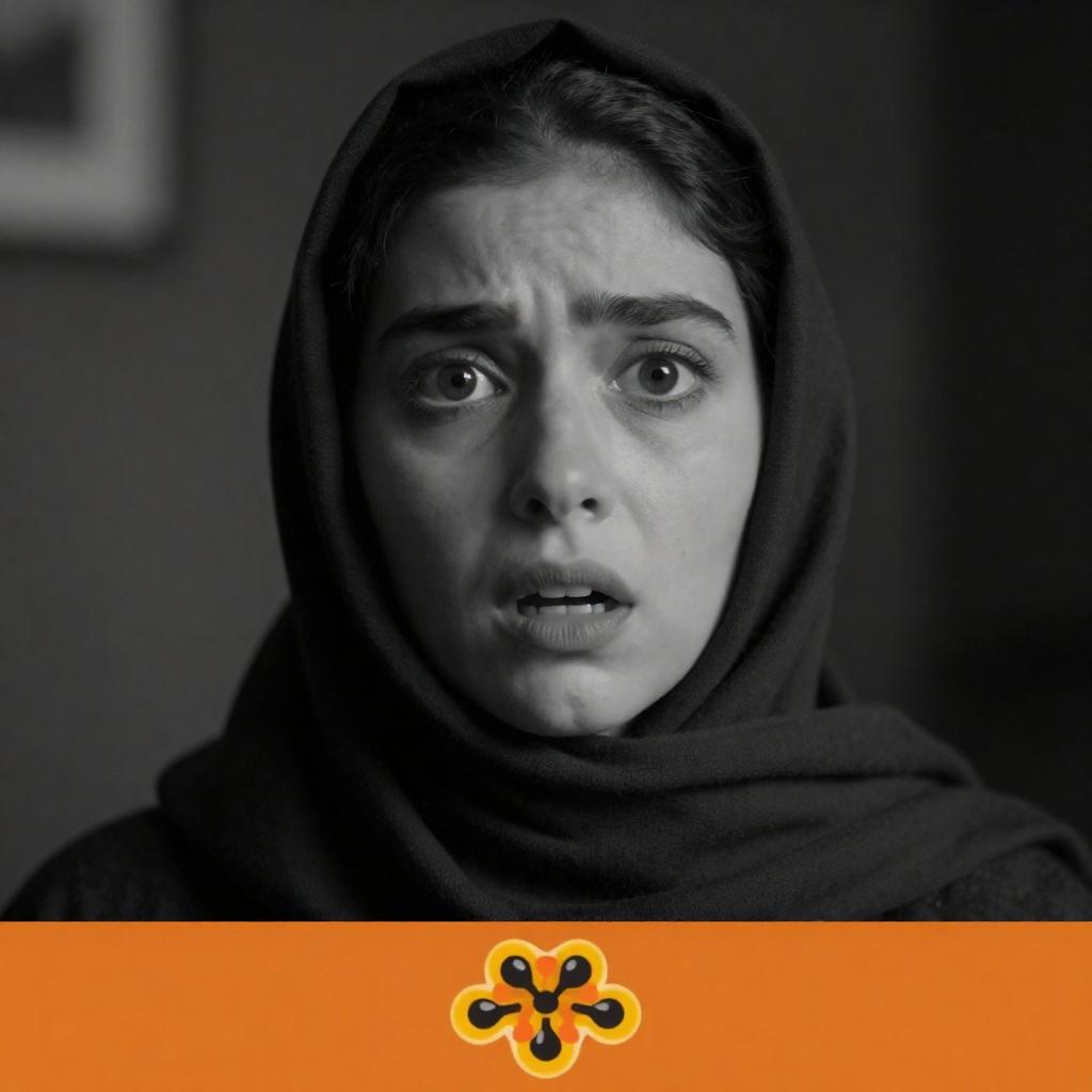 Black-and-white photograph of a woman with wide, terrified eyes and open mouth, wearing a dark headscarf. Her expression conveys intense fear. The background is blurred and dark. The image has a bold orange and black overlay at the bottom, with "a passion" highlighted in orange.