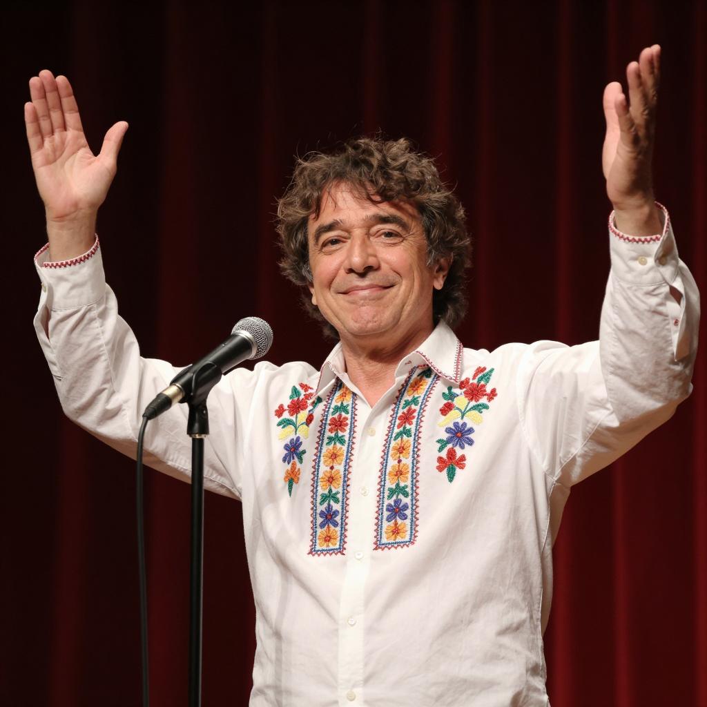 Smiling man with short dark brown hair wearing a blue short-sleeved shirt, sitting in a recording studio. He holds a microphone close to his mouth and raises his right hand while holding an electric guitar. The background features blurred studio equipment and warm lighting.