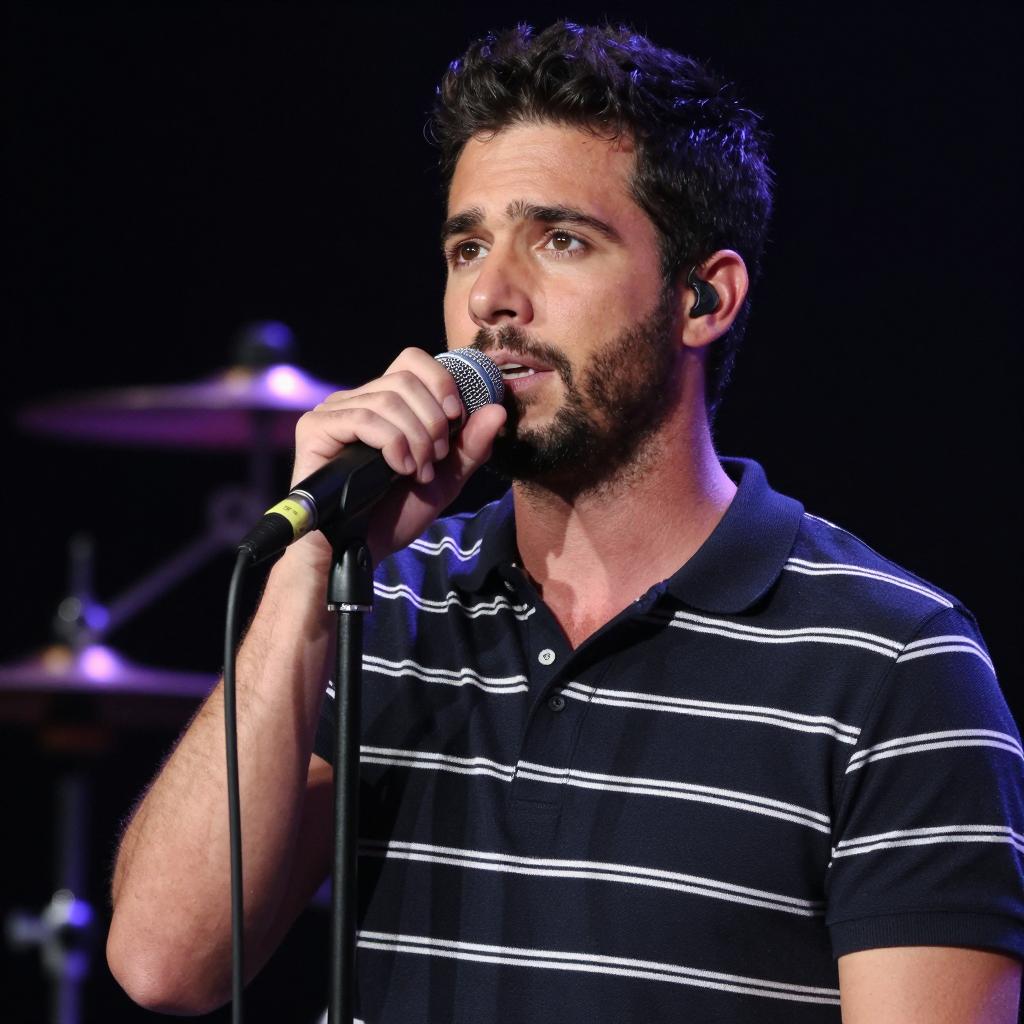 Photograph of a smiling man with short, dark brown hair, wearing a blue short-sleeved shirt, sitting in a recording studio. He raises his right hand, holding a microphone close to his mouth with his left hand on an electric guitar. Background includes blurred studio equipment and warm lighting.