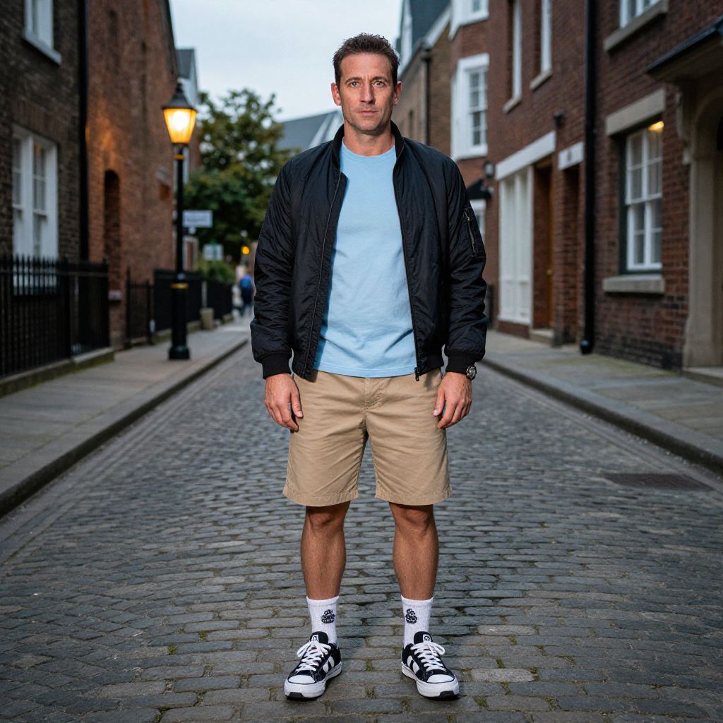 A man, light blue performance t-shirt, black quilted bomber jacket, khaki shorts, black and white sneakers, breathable ankle socks, cobblestone streets, Victorian architecture, gas lamps glowing, pinhole camera style, relaxed expression Man has masculine face and piercing eyes