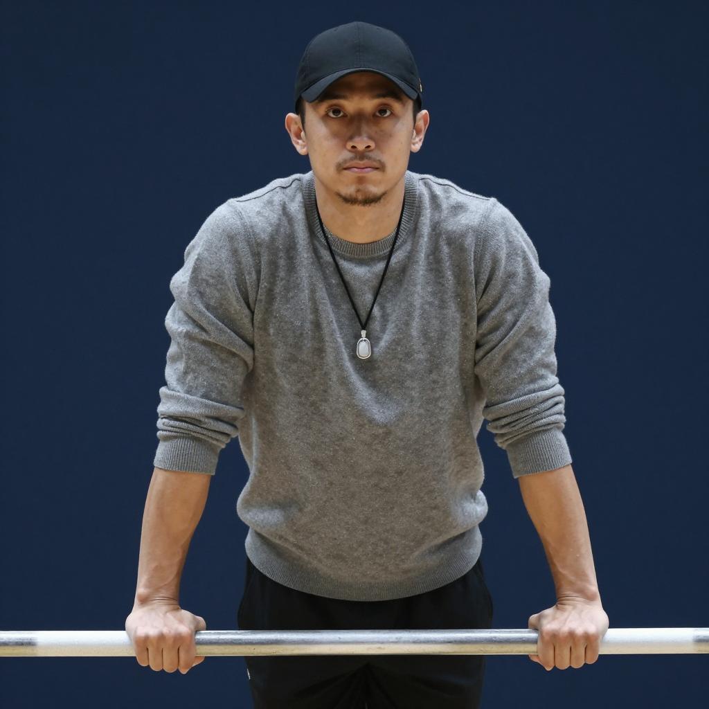 Photograph of a young Asian man with short black hair, wearing a black sleeveless shirt and black pants, gripping a yellow swimming lane marker with his right hand while lying on his back in a bright blue pool. His face shows a determined expression. His left leg is raised, showing the sole of his black shoe. The background shows the pool's blue surface with light reflections.