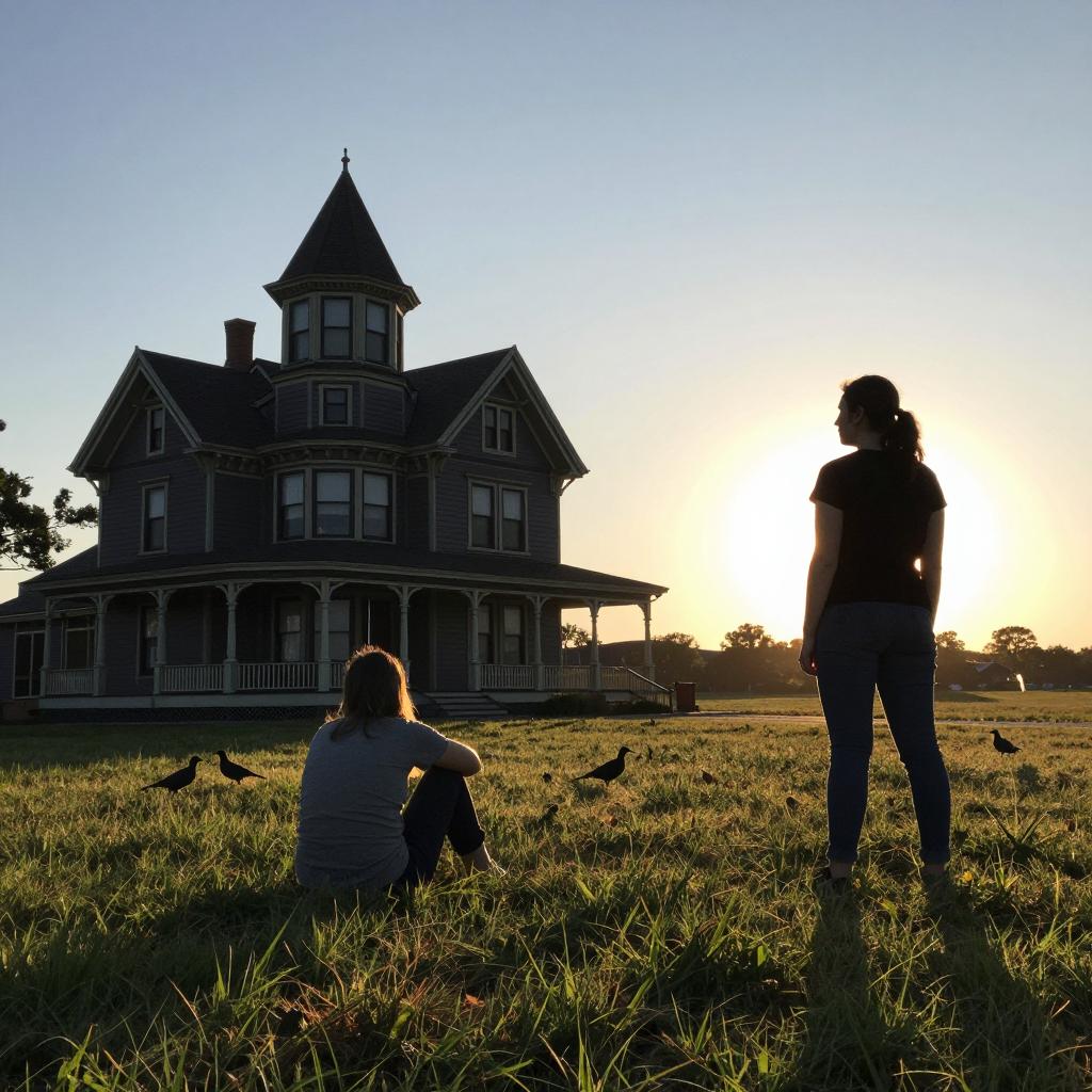 A sunset scene. Two people stand in a grassy field, silhouetted against the light. A large, dark-colored Victorian-style house with a tower and porch sits in the background. Several birds forage near the house. Person on the left sits with knees up, facing the house. Person on the right stands with arms at sides, facing the field. Both figures are in shadow.