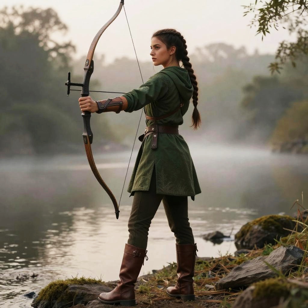 Warrior Braid hairstyle on female archer, wearing forest green hooded tunic and leather boots, in misty riverbank, captured in fashion editorial style with early dawn light.
