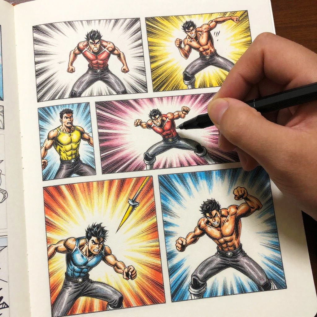 Drawing to story: a hand drawing a comic scene that comes alive with motion and emotion, pencil sketches turning into dynamic characters and dramatic panels, vibrant colors and expressive poses, energetic and narrative-rich composition.