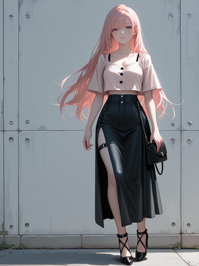 Digital anime-style drawing of a pink-haired girl in a light blue dress and white sneakers, standing against a sunlit white wall.