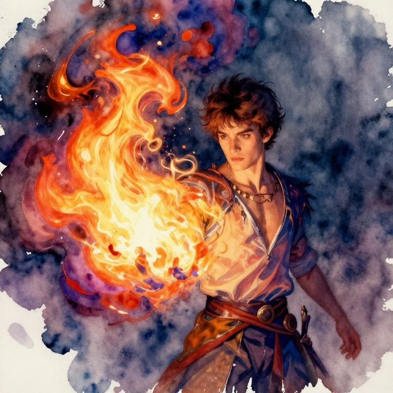 Digital painting of a young, handsome, brown-haired male wizard with a determined expression. He is dressed in a partially unbuttoned, torn blue shirt revealing a muscular chest, and a brown belt with a sheath. His right hand is glowing with intense, swirling orange and yellow flames, set against a smoky, dark blue background. The wizard's left hand is relaxed by his side, and his dark eyes focus intently on the flame. The watercolor-like texture adds a dynamic, magical feel to the image, enhancing the dramatic contrast between the fiery spell and the dark, cloudy background.