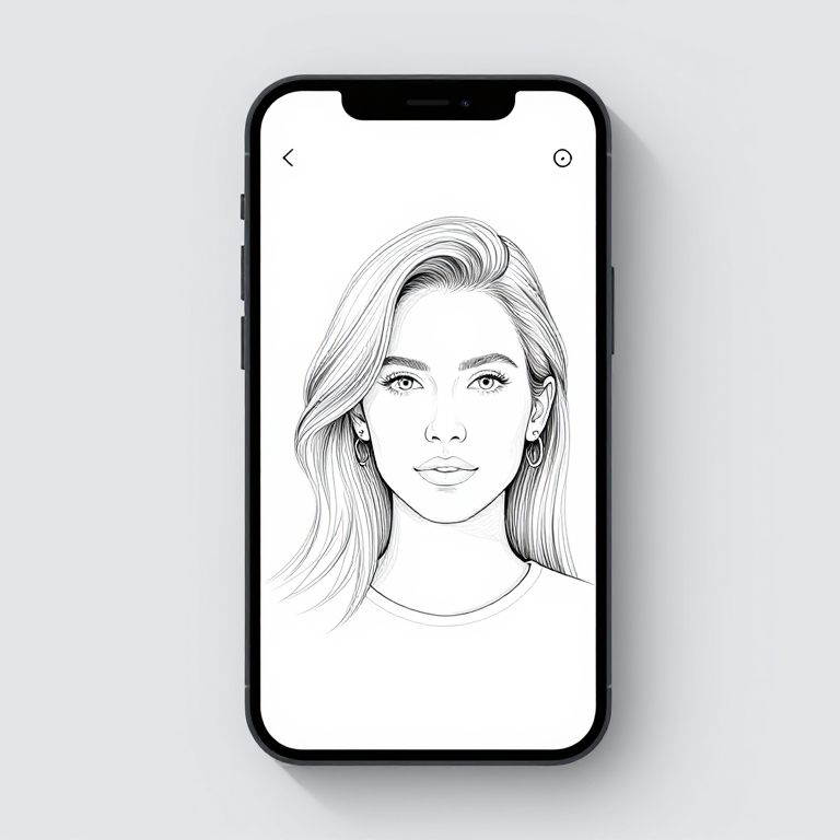 Photo to line art app interface on a sleek modern smartphone, showing transformation of a colorful portrait into detailed black and white line art, digital art style, clean UI, high resolution, minimalistic background, tech vibe