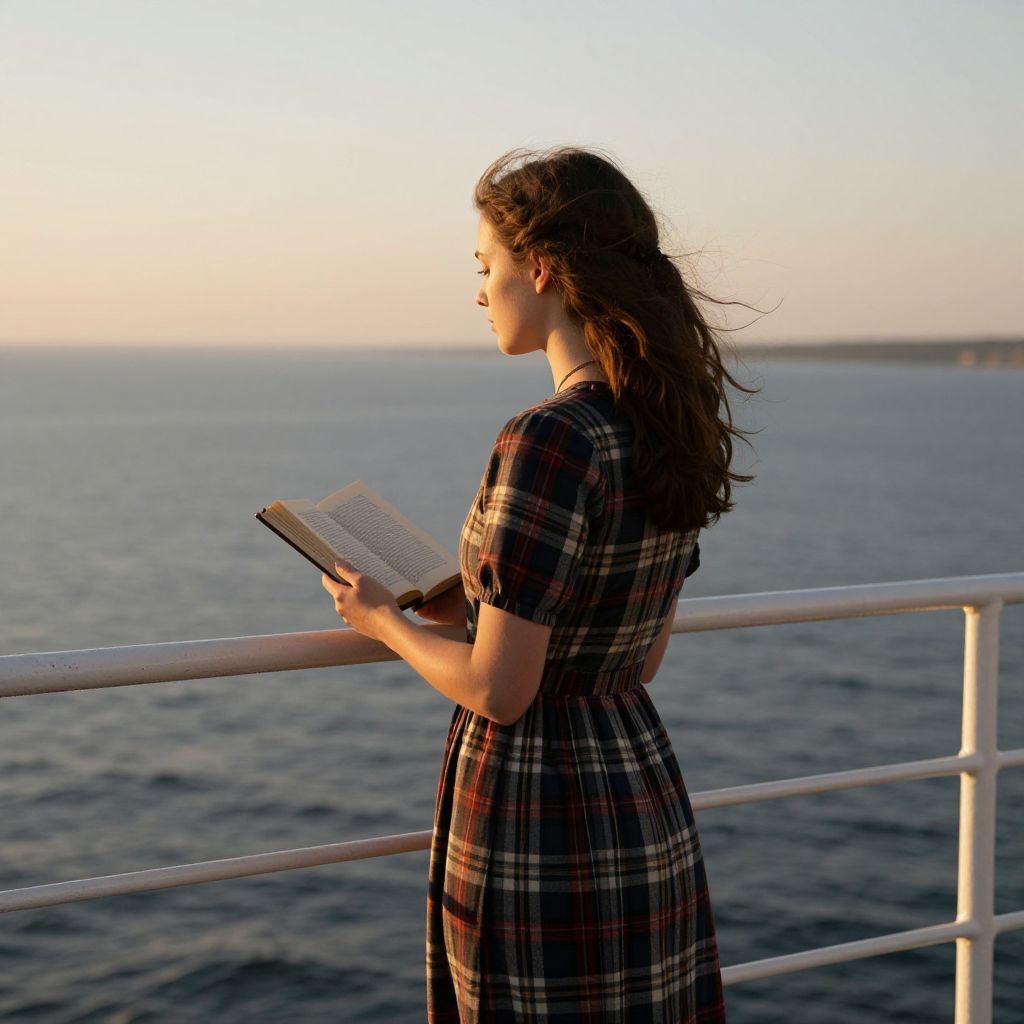 Serenity and introspection blend as a woman in tartan dress stands by the railing of a ship, her hands cradling an open hymnal, the gentle hum of the sea and the warmth of the setting sun enveloping her in a moment of quiet reflection and spiritual connection.