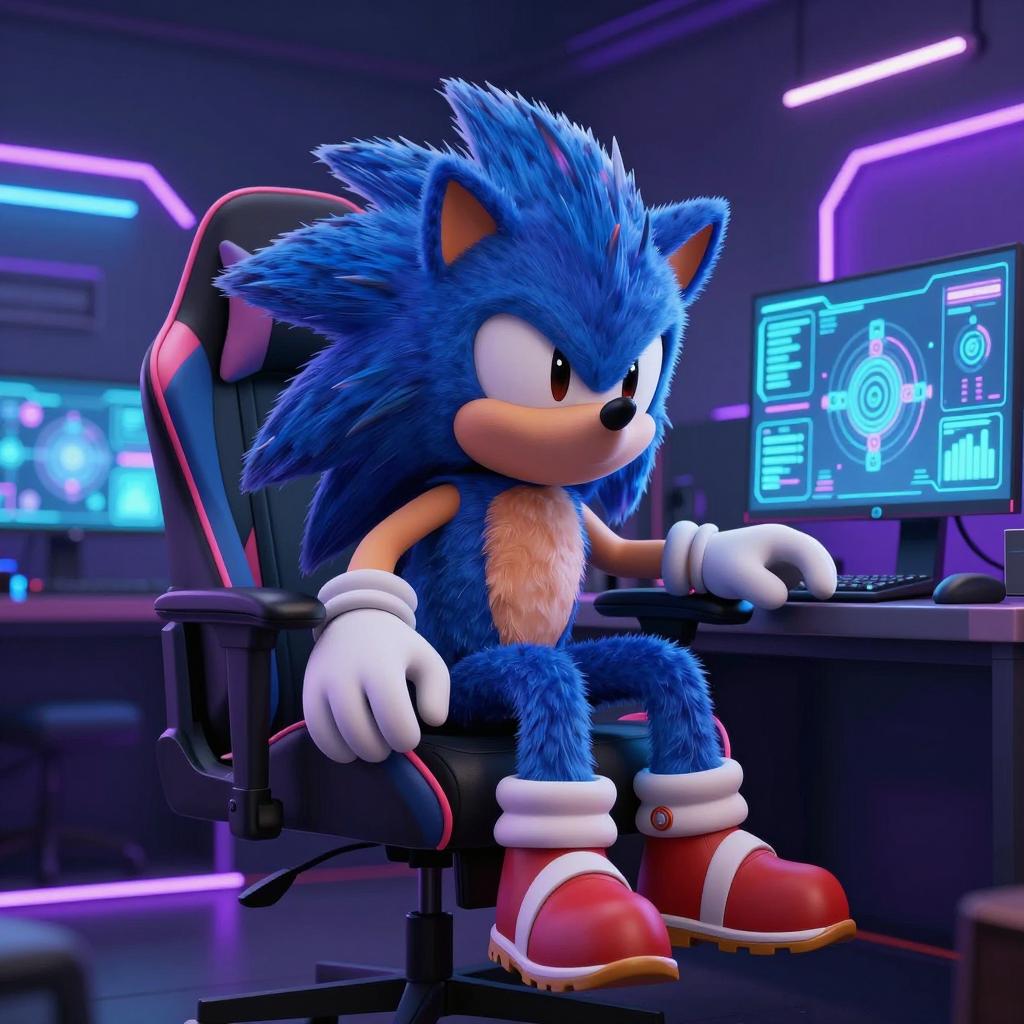 3D rendered anthropomorphic hedgehog character sitting in a modern gaming chair with neon lighting, wearing futuristic armor and boots. The hedgehog is engaging with a computer setup featuring multiple screens with glowing holographic interfaces in a dark gaming room illuminated by blue and purple neon lights.