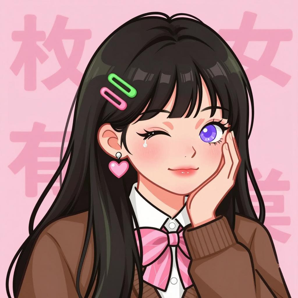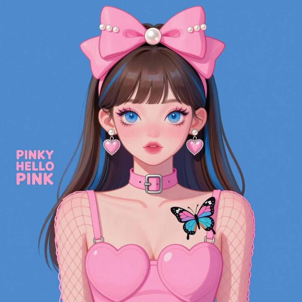 Digital illustration of a topless woman with long black hair and bangs, blue eyes, wearing a pink collar with a heart-shaped tag. She has a pink-tinted complexion. A pink and red hair accessory with an enclosed scene is on her right side. Bright pink background. Star-like sparkles around her. Watermark "@starknightart" in the bottom right.